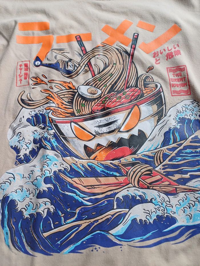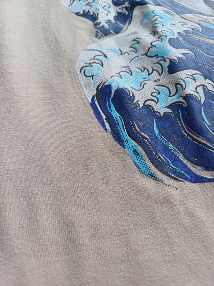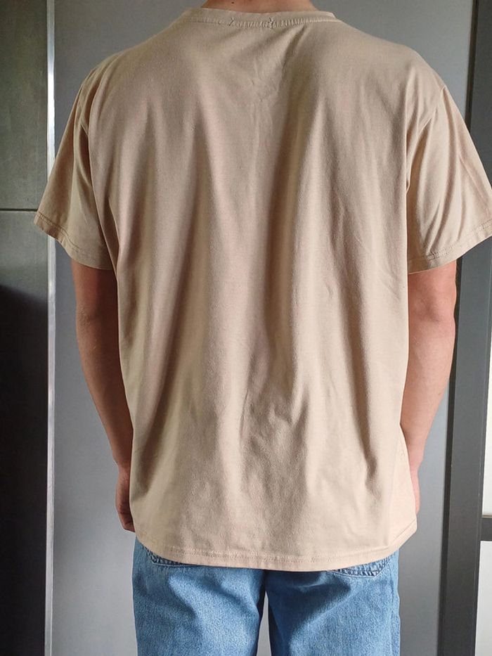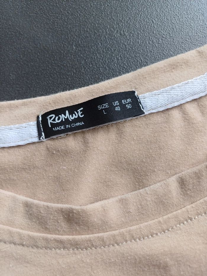 Tee-shirt beige imprimé. Matière épaisse et douce. Petites taches d'encre en bas à gauche : voir dernière photo. Marque ROMWE