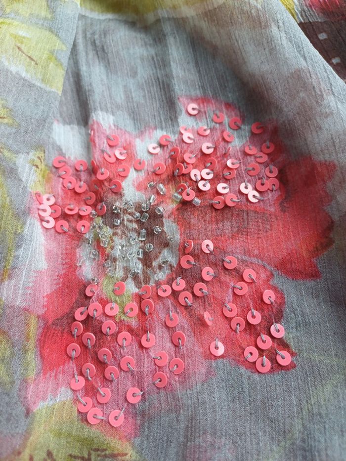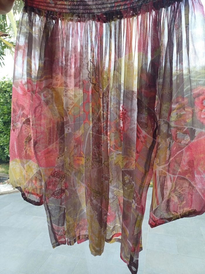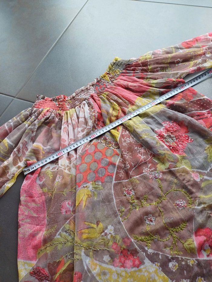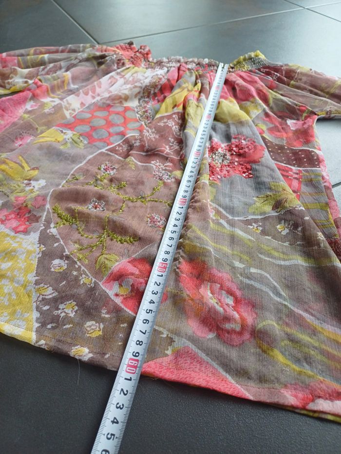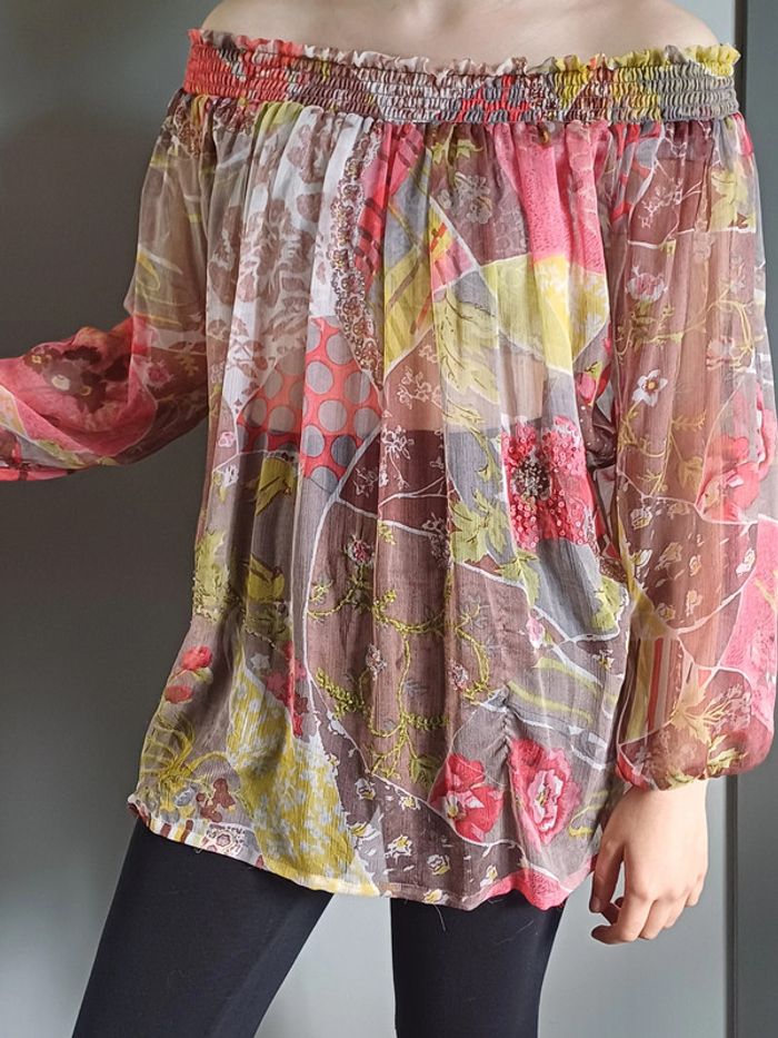 Col élastique avec plusieurs façon de le porter : col rond ou épaules dénudées. Tissu légèrement transparent. De jolis reliefs avec des perles. Taille M/L