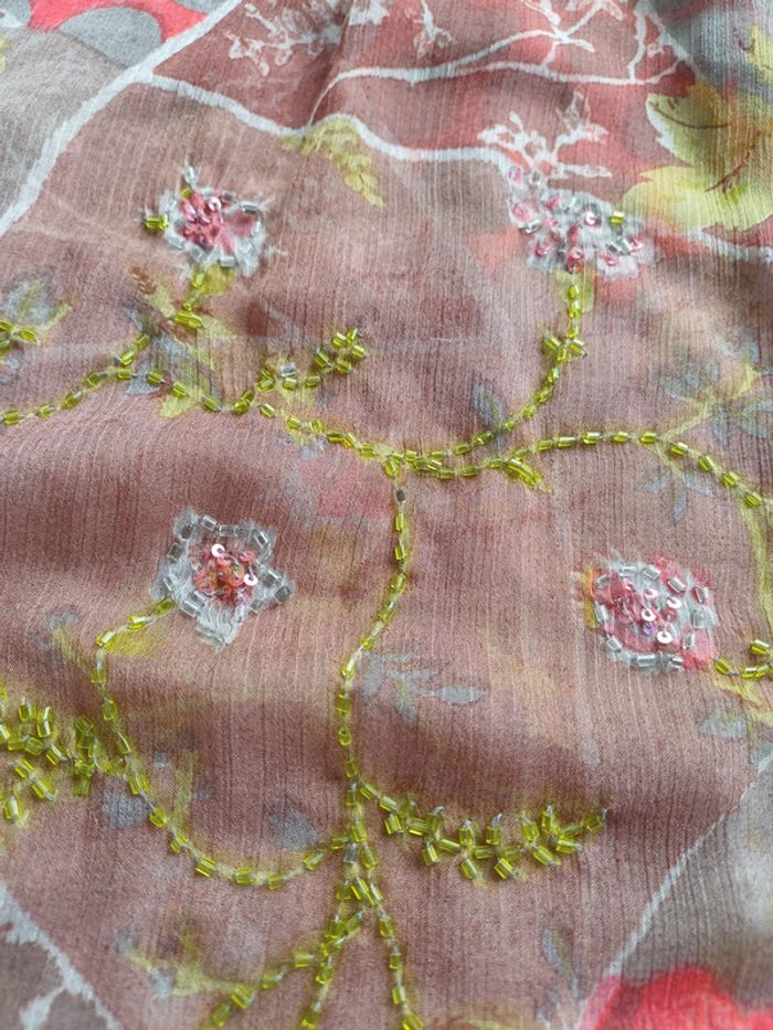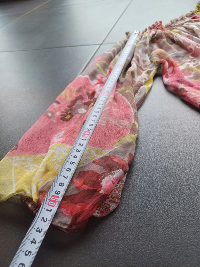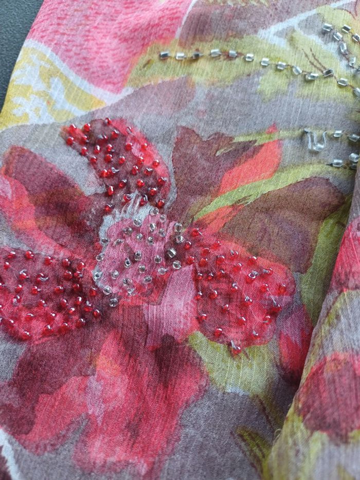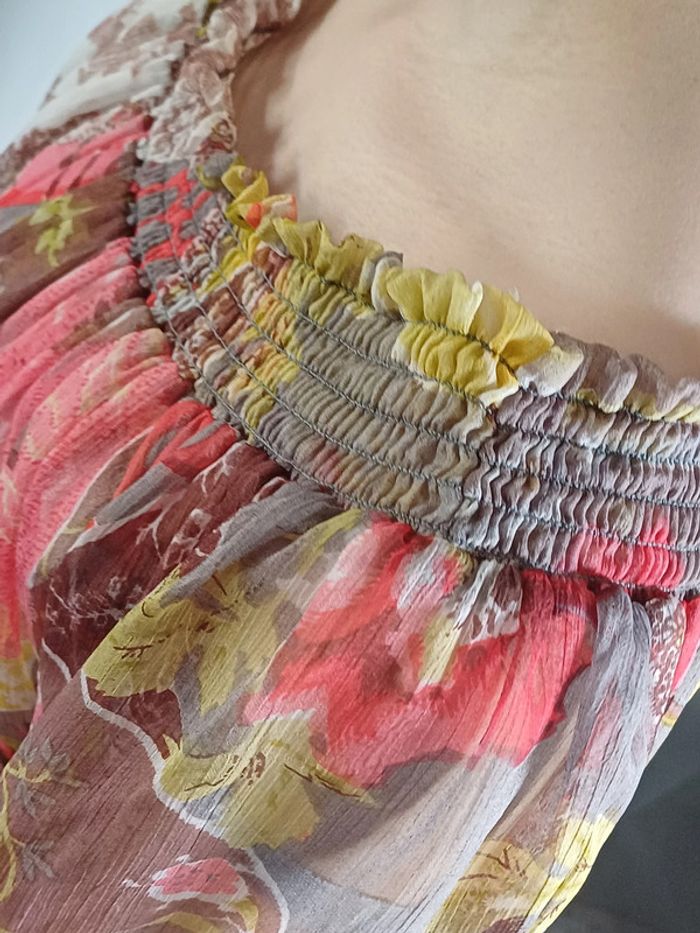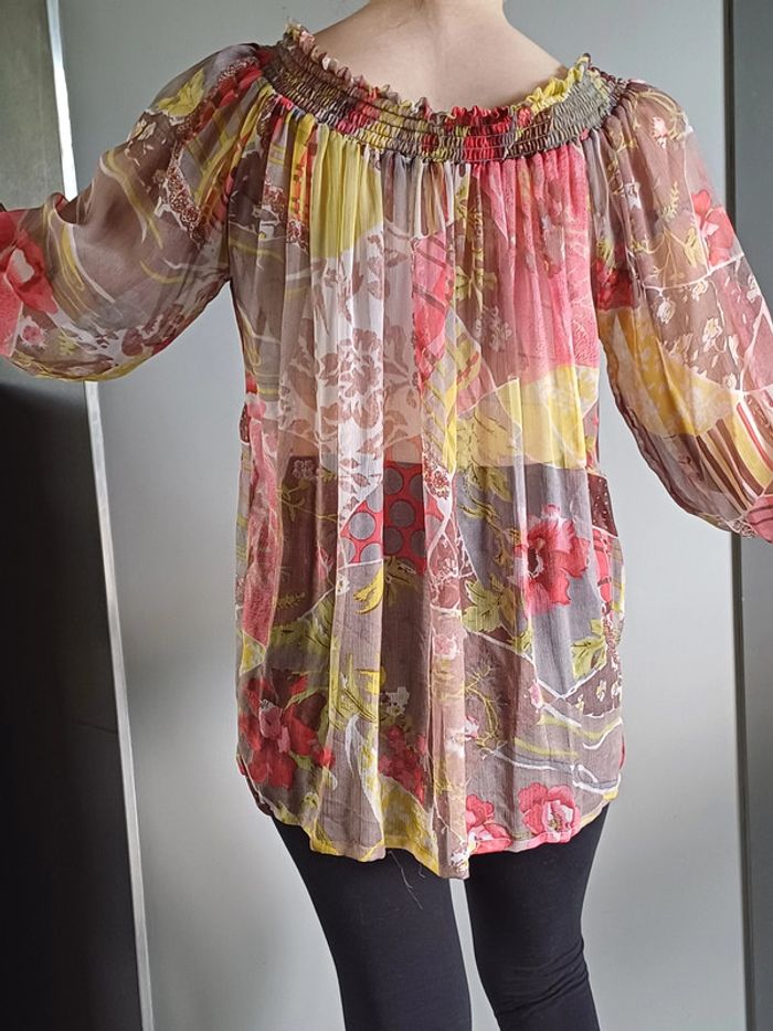 Col élastique avec plusieurs façon de le porter : col rond ou épaules dénudées. Tissu légèrement transparent. De jolis reliefs avec des perles. Taille M/L