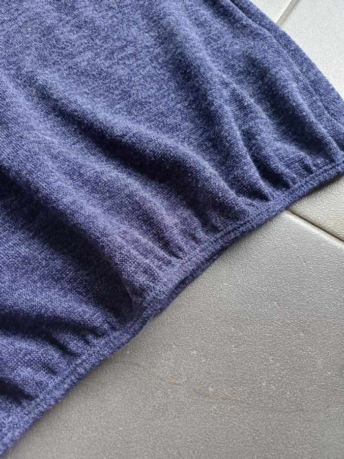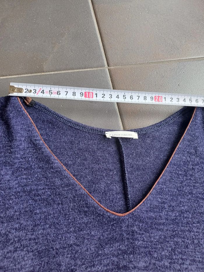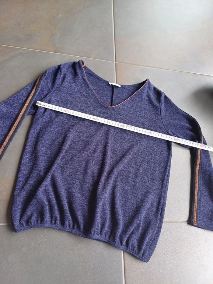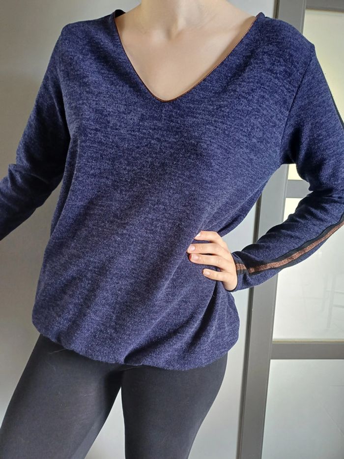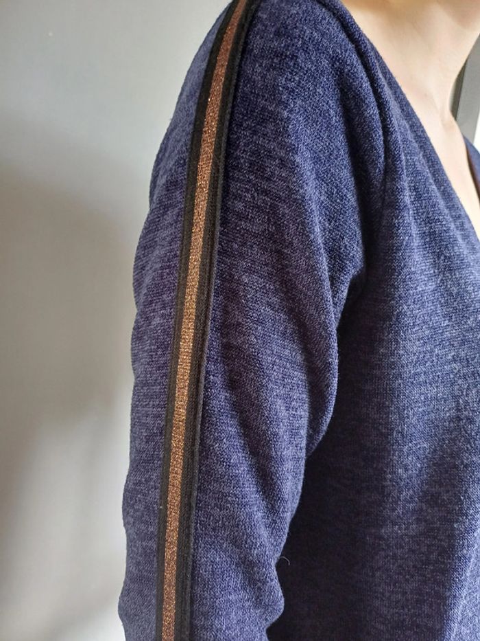 Col en V avec liseré brillant bronze. Taille élastique. Liseré bronze/noir sur les manches. Matière très agréable à porter.