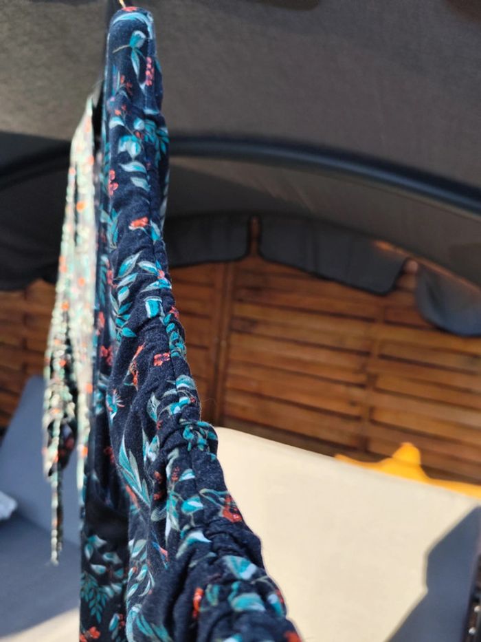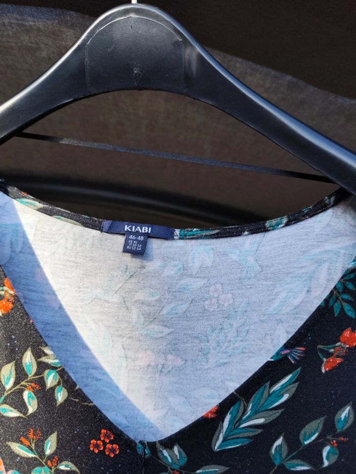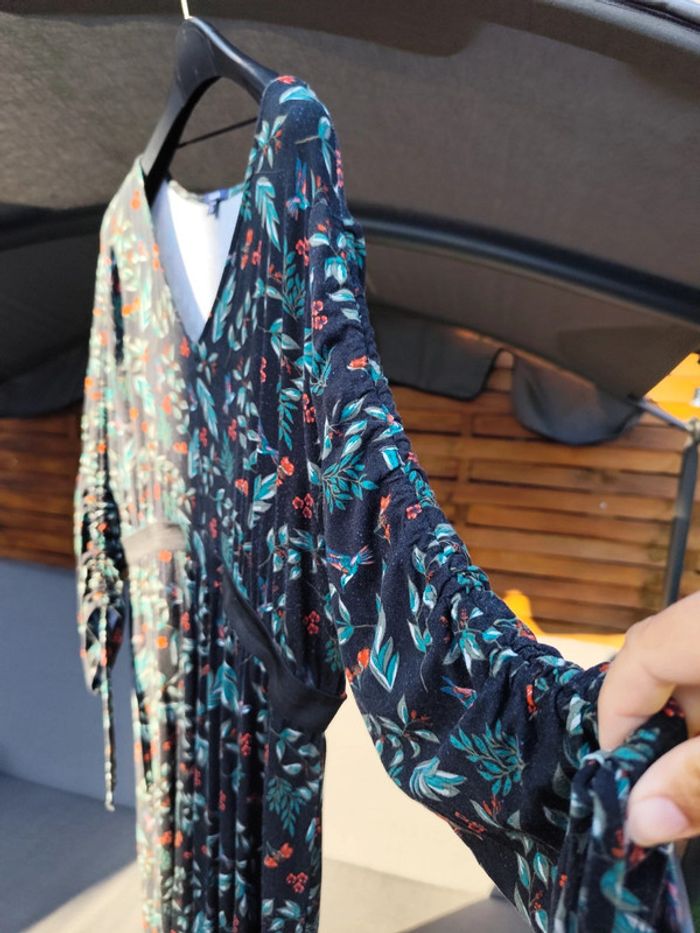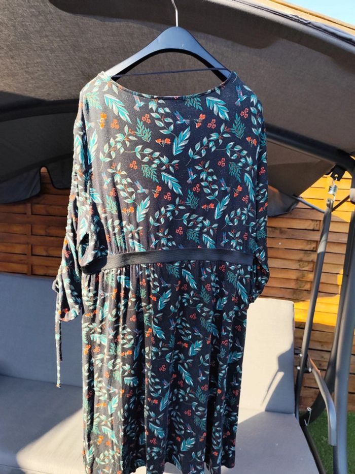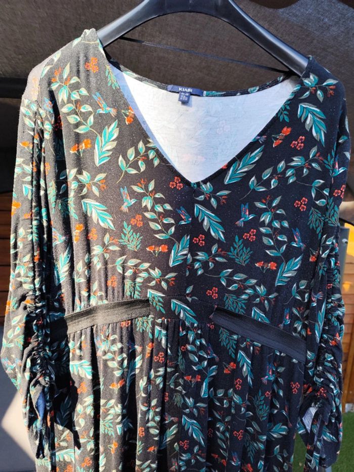 Robe 👗 col en V Manches 3/4 retroussables Longueur niveau des genoux Fond noir avec des dessins rouges et verts Taille sous poitrine élastique Taille 46/48 Bon état N'hésitez pas à regarder mon dressing pour faire un lot