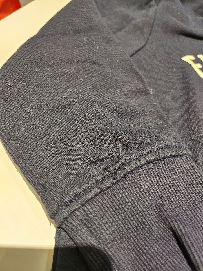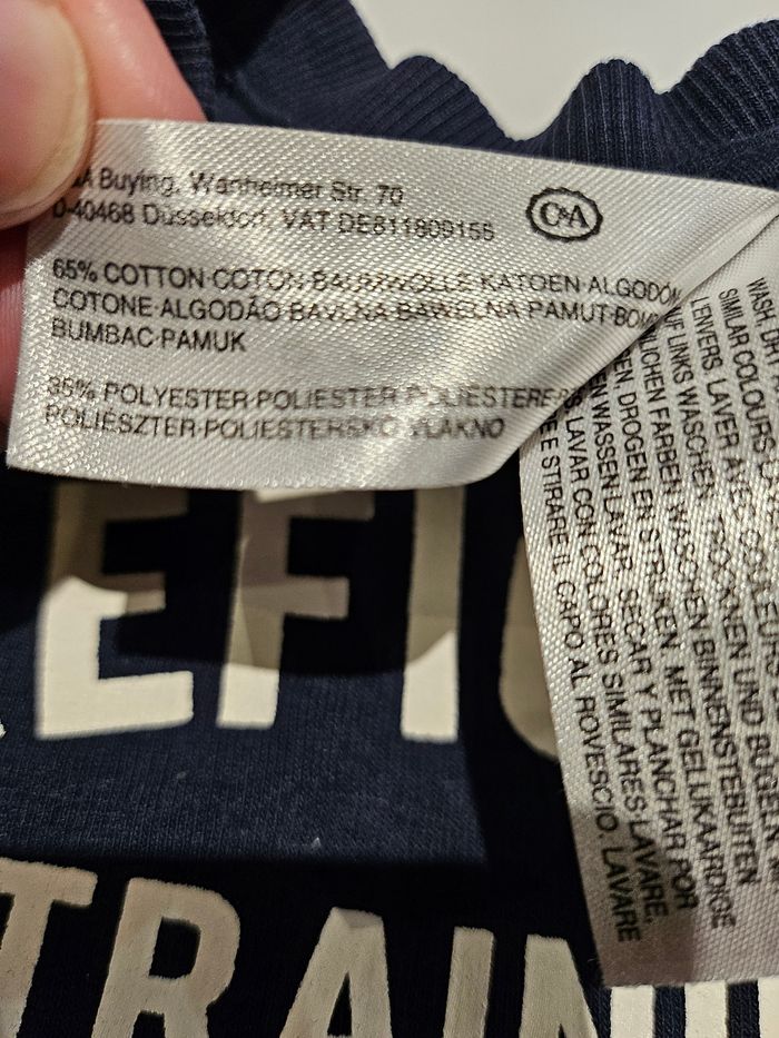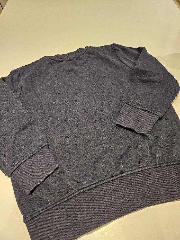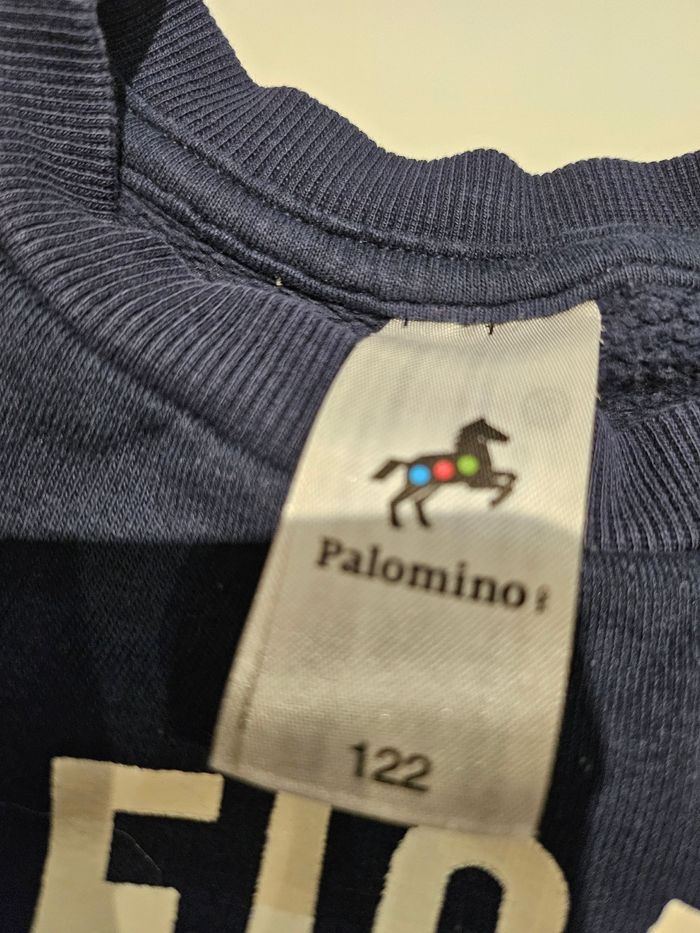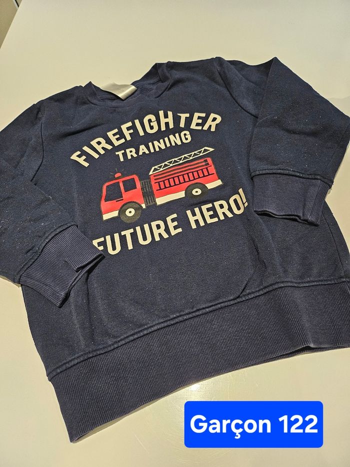 Pull bleu col rond. Imprimés pompier et écritures devant. Quelques bouloches. Marque: Palomino Taille : 122