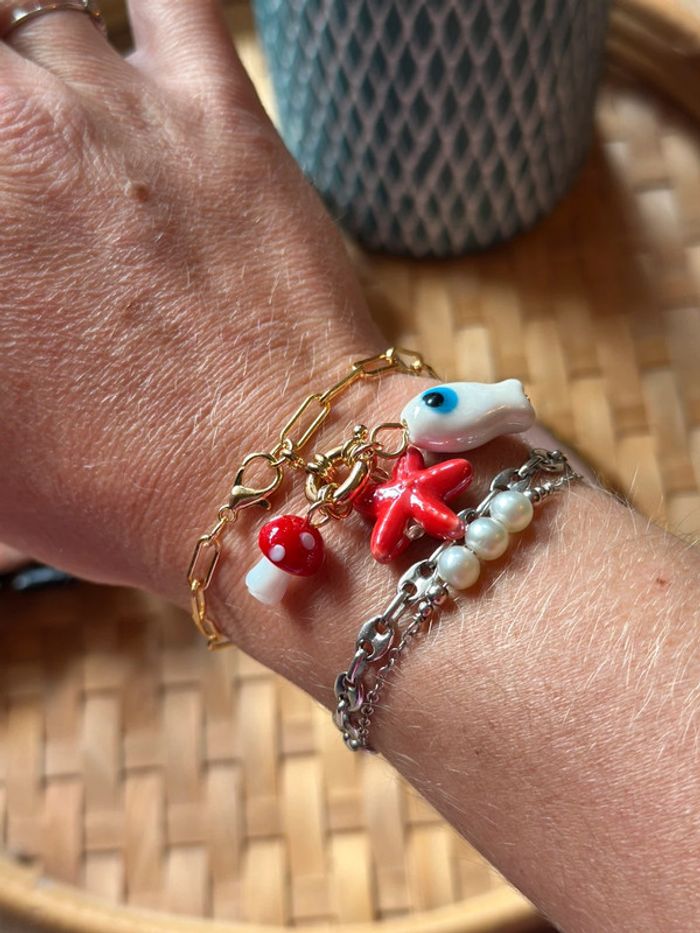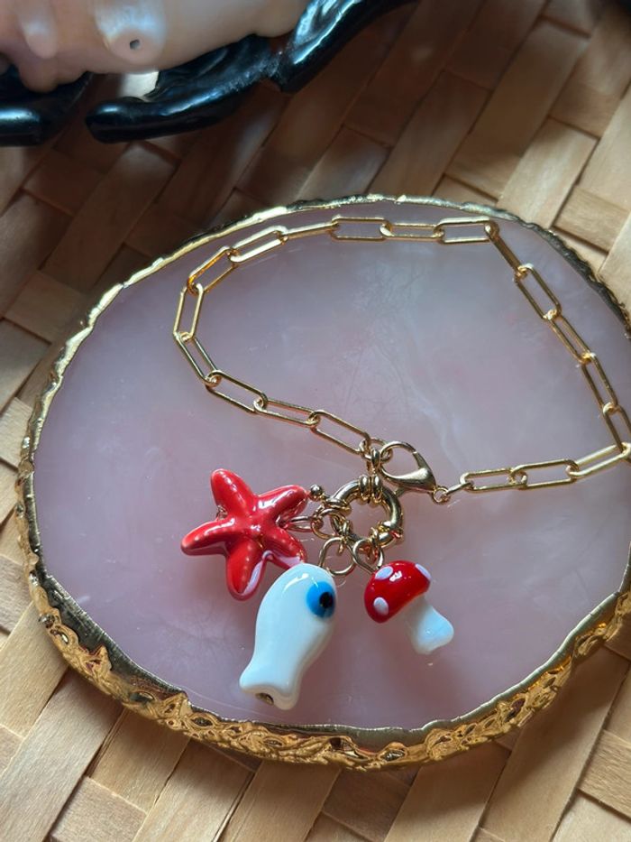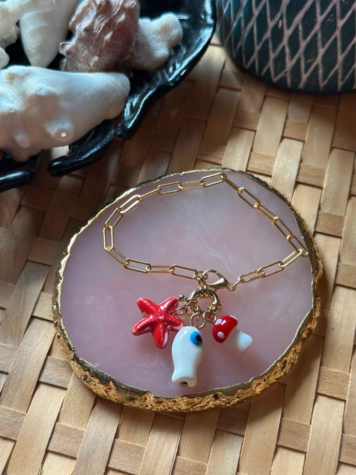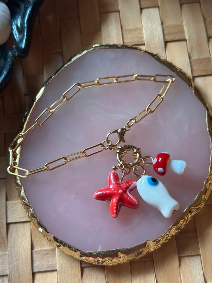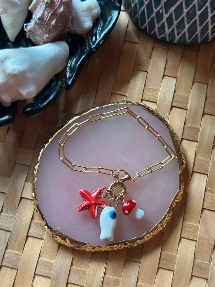 Superbe bracelet au look bohème chic, mêlant une fine chaîne dorée en acier inoxydable. Son design asymétrique est sublimé par de jolis pendentifs inspirés de l’univers marin : coquillage, étoile de mer, petit poisson… Un bijou délicat et original, parfait pour la belle saison ! Caractéristiques : ✔ Matériaux : acier inoxydable, perles et pierres naturelles ✔ Détails : perle blanche, poisson, étoile de mer ✔ État : très bon état, très peu porté ✔ 19 cm Un accessoire raffiné pour sublimer vos tenues estivales avec une touche de poésie.
