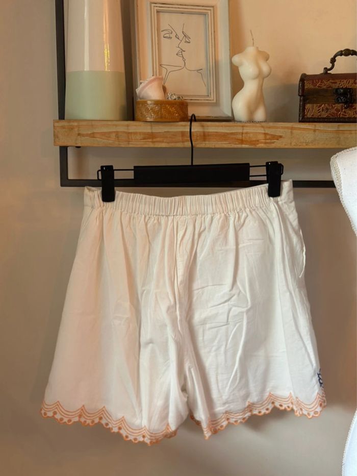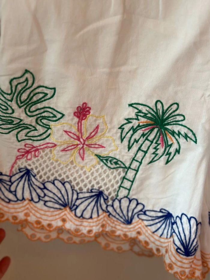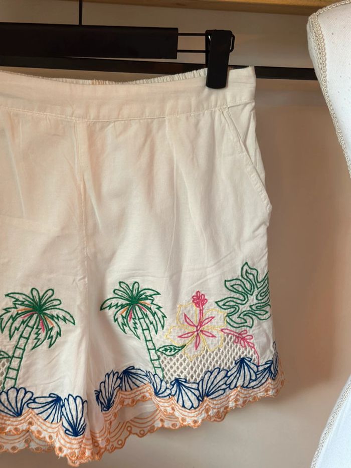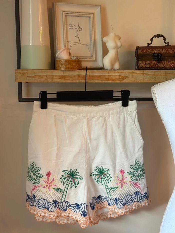 Short en coton blanc avec broderies colorées : palmiers, fleurs et coquillages pour un look estival ultra frais ! Taille 36, élastique à la taille, doublé, avec poches. Très bon état comme neuf, parfait pour la plage ou les balades en ville. ℹ️ Le prix est fixe et il n'est pas éligible à la remise.