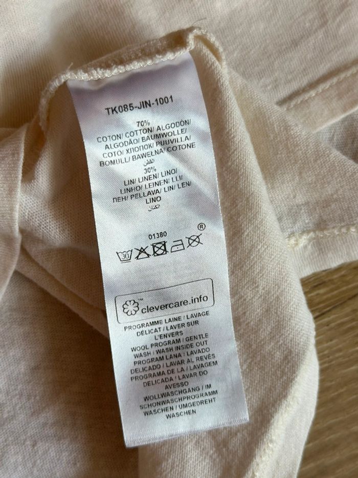 T-shirt élégant et léger de la marque Caroll, en très bon état. Couleur crème avec un joli liseré argenté au col en V, pour une touche chic et discrète. Composition : 70 % coton – 30 % lin (matière naturelle, respirante et confortable). Tissu doux, légèrement texturé, de belle qualité. Taille L – Convient à un 40/42. Largeur à plat sous aisselles : env. 50/52cm. Tombé fluide, parfait à porter seul ou sous une veste. Entretien : lavage délicat, programme laine à 30°, à l’envers.