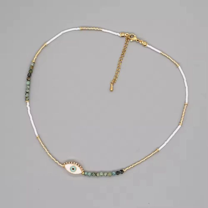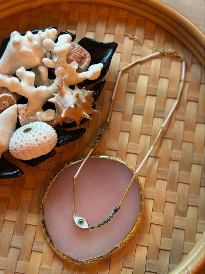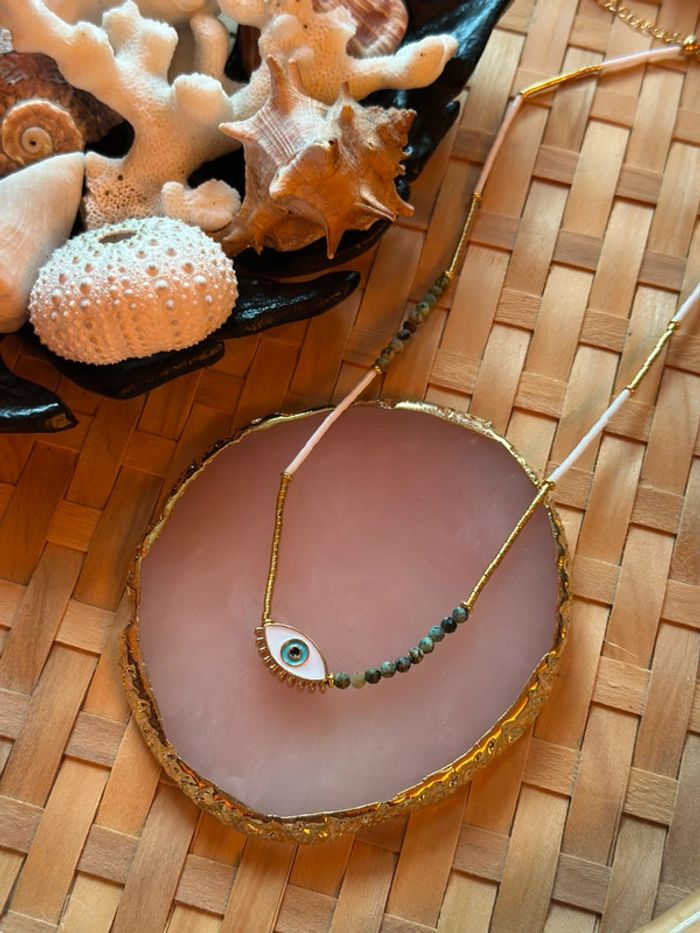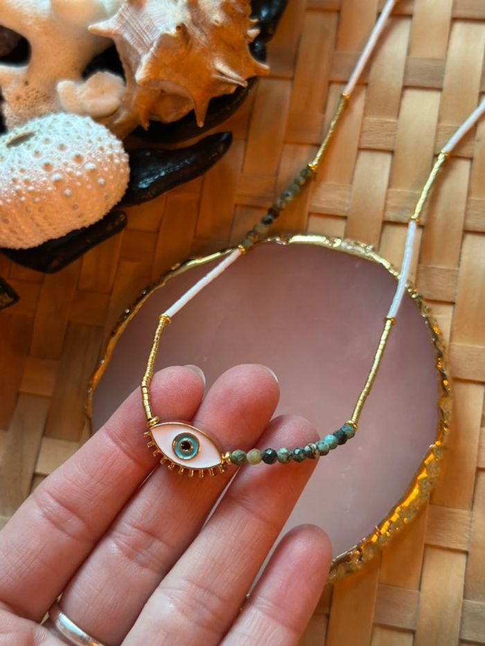 Collier original et tendance composé de : • perles naturelles & perles en plastique (tons vert, blanc, doré) • pendentif œil protecteur doré • chaîne en acier inoxydable (résistante à l’eau et aux allergies) Longueur : 45 cm + 5 cm réglables Parfait pour un look bohème chic, plage ou été. Neuf, jamais porté.
