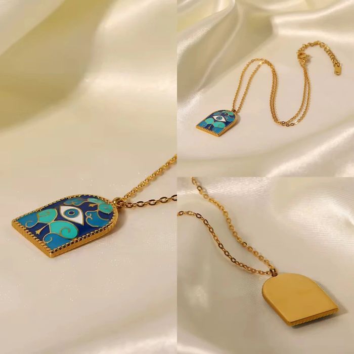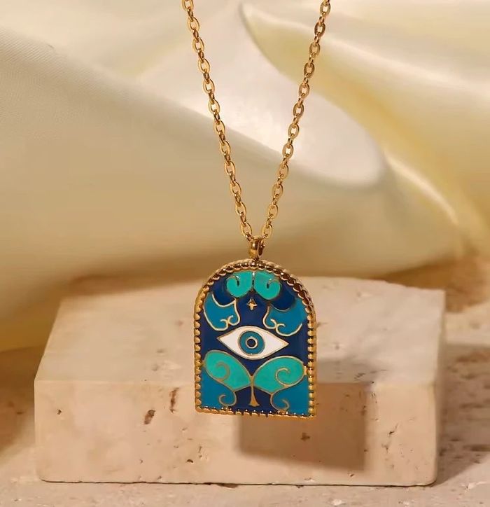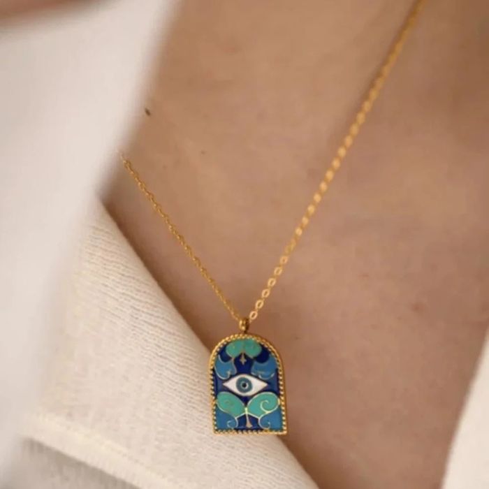 Collier tendance en acier inoxydable doré avec pendentif émaillé en forme de porte stylisée, décoré d’un œil bleu protecteur (style “œil grec”). Longueur : env. 45 cm + chaîne réglable. Résistant à l’eau, ne noircit pas, parfait pour une touche mystique et colorée. Neuf, jamais porté.