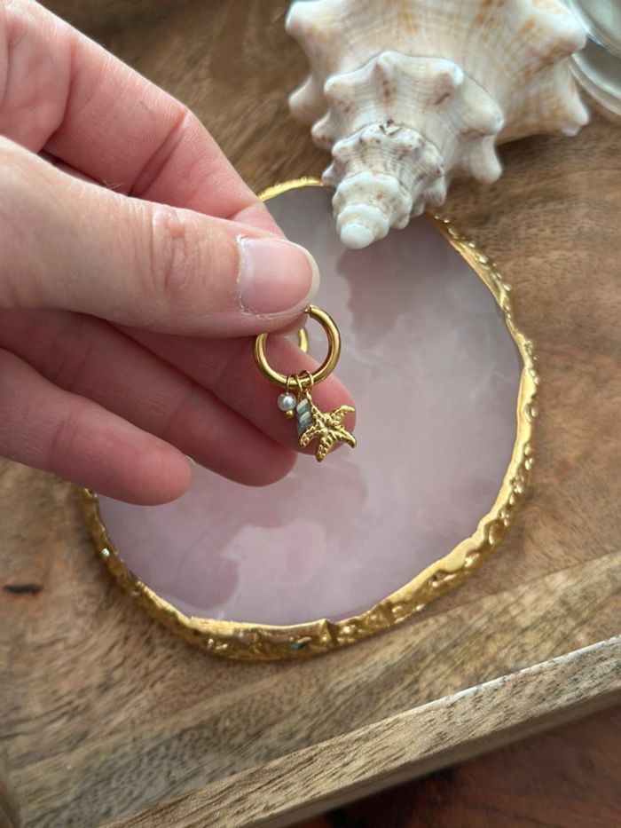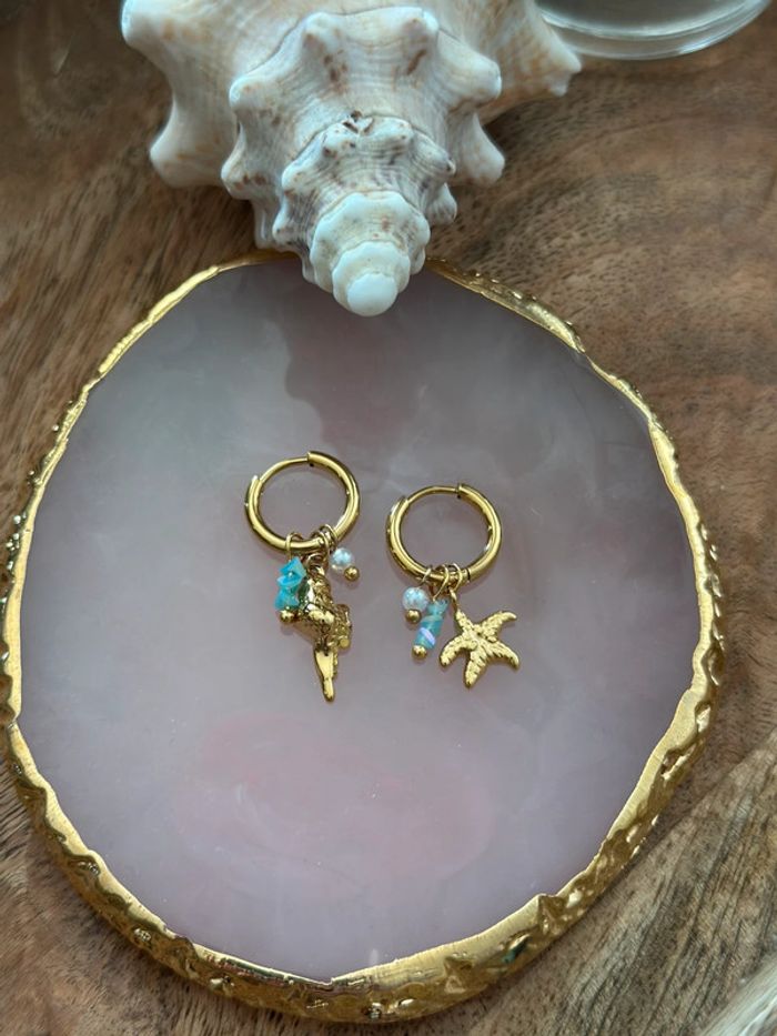 Paire de boucles d’oreilles dorées à breloques coquillage & étoile de mer, avec perles et touches de turquoise. Tendances et légères, elles sont parfaites pour l’été, que ce soit en bord de mer ou en ville. En acier inoxydable : • Résistantes à l’eau (waterproof) • Hypoallergéniques, idéales pour peaux sensibles • Ne noircissent pas, ne laissent pas de traces Dimensions : Hauteur totale : 3,3 cm Poids léger : 2,9 g État : neuf