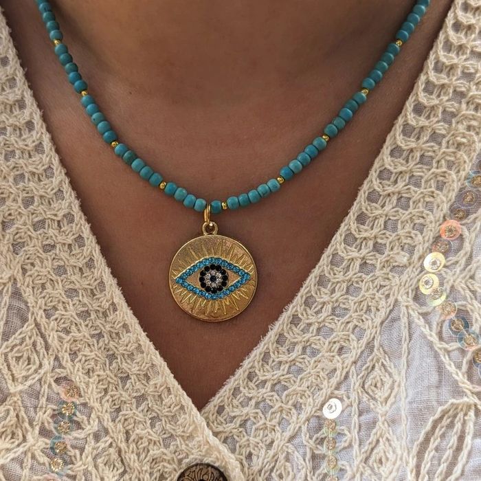Collier perles bleues & pendentif œil porte-bonheur neuf, acier inoxydable