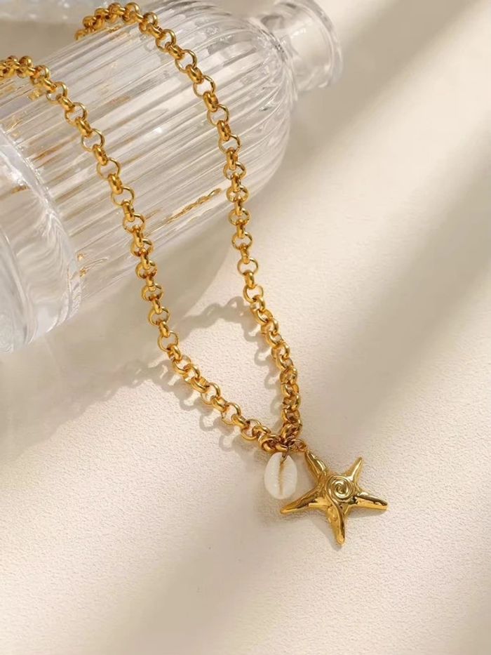 Collier en acier inoxydable doré, orné d’un pendentif étoile de mer et d’un petit coquillage pour une touche marine chic. Longueur réglable de 44 à 49 cm. Léger (23 g), tendance et parfait pour un look d’été. Neuf, jamais porté.