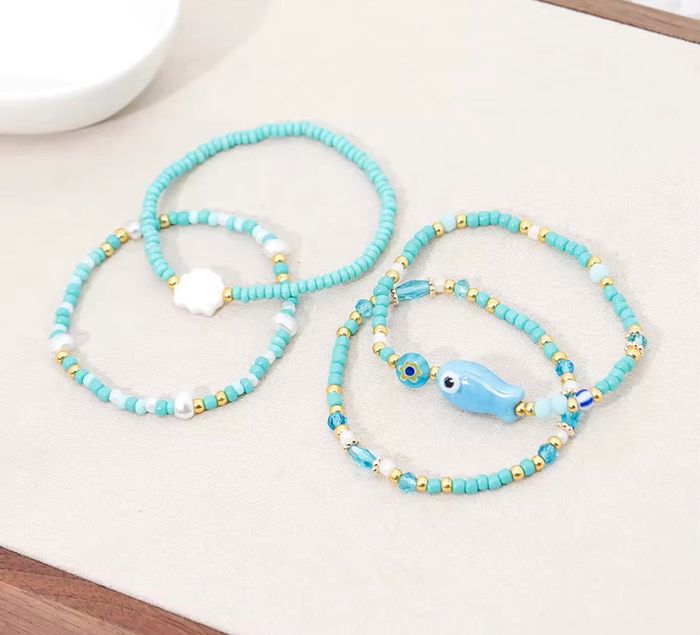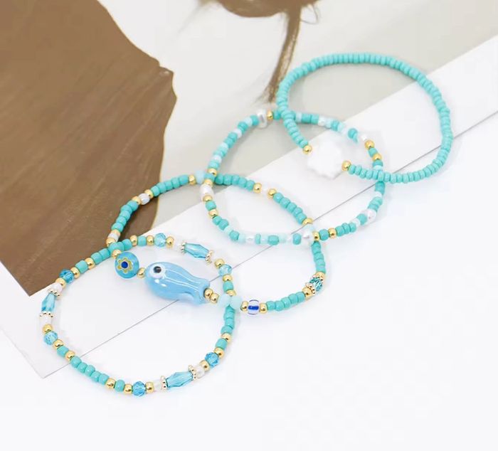 Lot de 4 bracelets assortis, esprit bord de mer avec petits poissons, coquillages et perles bleues. Fait-main, parfait pour accessoiriser vos looks estivaux avec une touche bohème et colorée. • Diamètre (élastique) : environ 5 cm • Matières : perles synthétiques, détails dorés, breloques fantaisie • Couleurs : bleu turquoise, blanc, doré • Vendu uniquement en lot de 4 – pas de vente à l’unité Neuf, jamais porté.