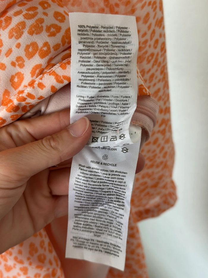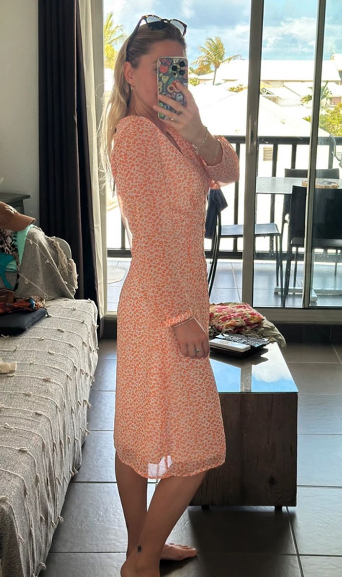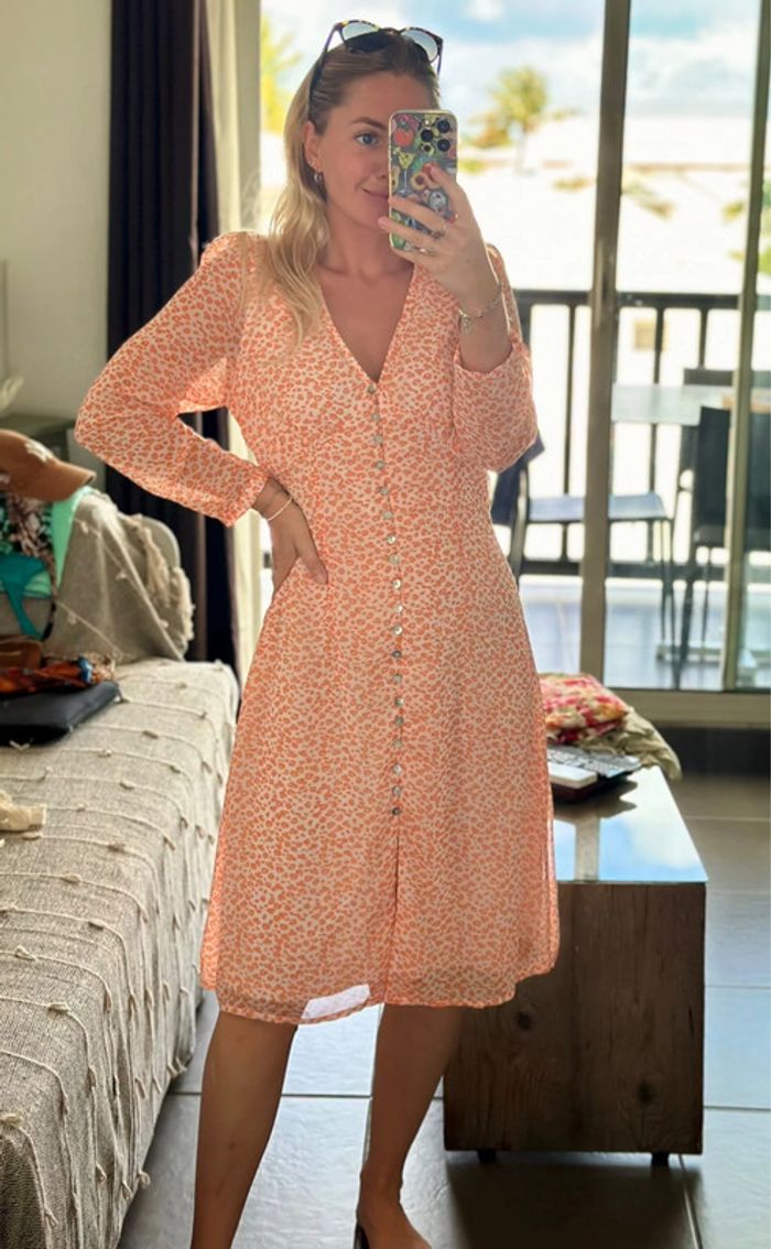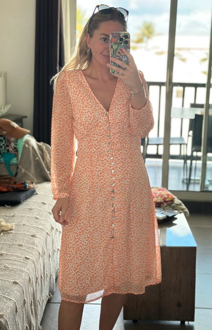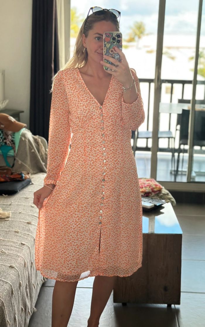 Robe neuve avec étiquette (prix : 59,99 €). Taille S, coupe bien ajustée. Col en V avec boutons nacrés sur toute la longueur. Tissu léger et confortable à porter. Coloris : rose très clair avec motifs de petites fleurs orange.