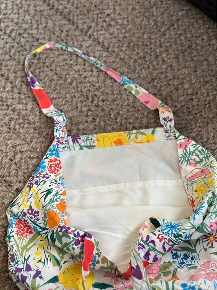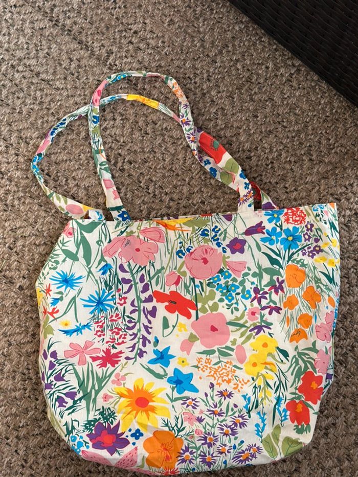 Ce sac cabas fourre-tout est parfait pour le shopping, la plage ou les balades en ville. Confectionné dans un tissu en coton doux, il est à la fois léger et spacieux. Son motif floral coloré lui donne un style bohème et original, idéal pour celles qui aiment les pièces uniques. • Dimensions : 44 cm (largeur) x 34 cm (hauteur) x 15 cm (profondeur) • Hauteur des anses : 28 cm (porté épaule confortable) • Matière : tissu en coton doux • Grande capacité – parfait pour y glisser un ordinateur, une serviette, des courses, etc. • Couleurs : tons pastel et motifs fleuris, chaque pièce est unique • État : neuf