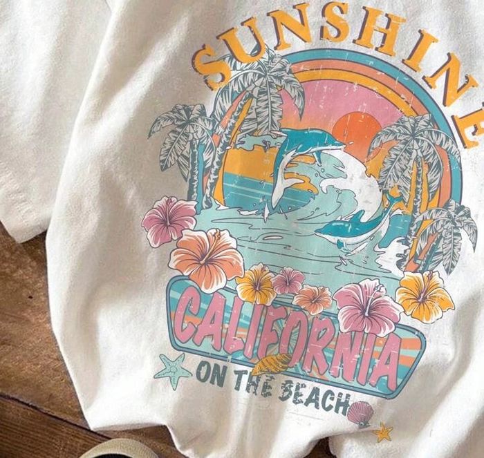 Envie d’un look estival et décontracté ? Ce t-shirt “Sunshine California” est un incontournable ! Avec son imprimé coloré de coucher de soleil, dauphins et fleurs tropicales, il apporte une vraie vibe de vacances. Coupe oversize tendance, parfait porté loose sur un short, un jean taille haute ou même en robe pour les plus petites. • Taille : S • Coupe : légèrement oversize • Matière : 100 % coton (doux et respirant) • Couleurs : blanc cassé, imprimé multicolore • État : neuf, jamais porté