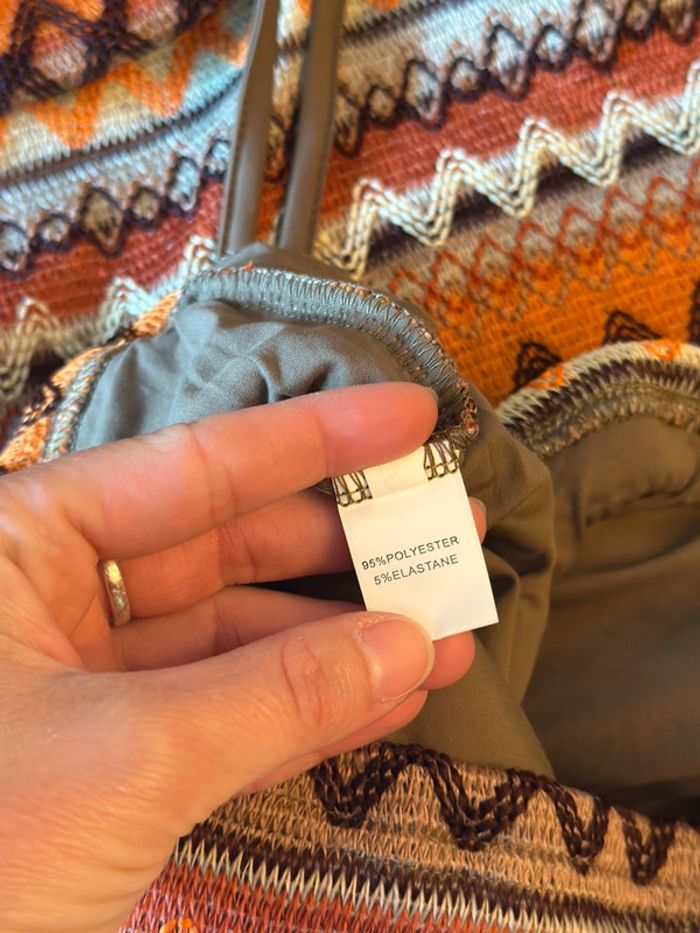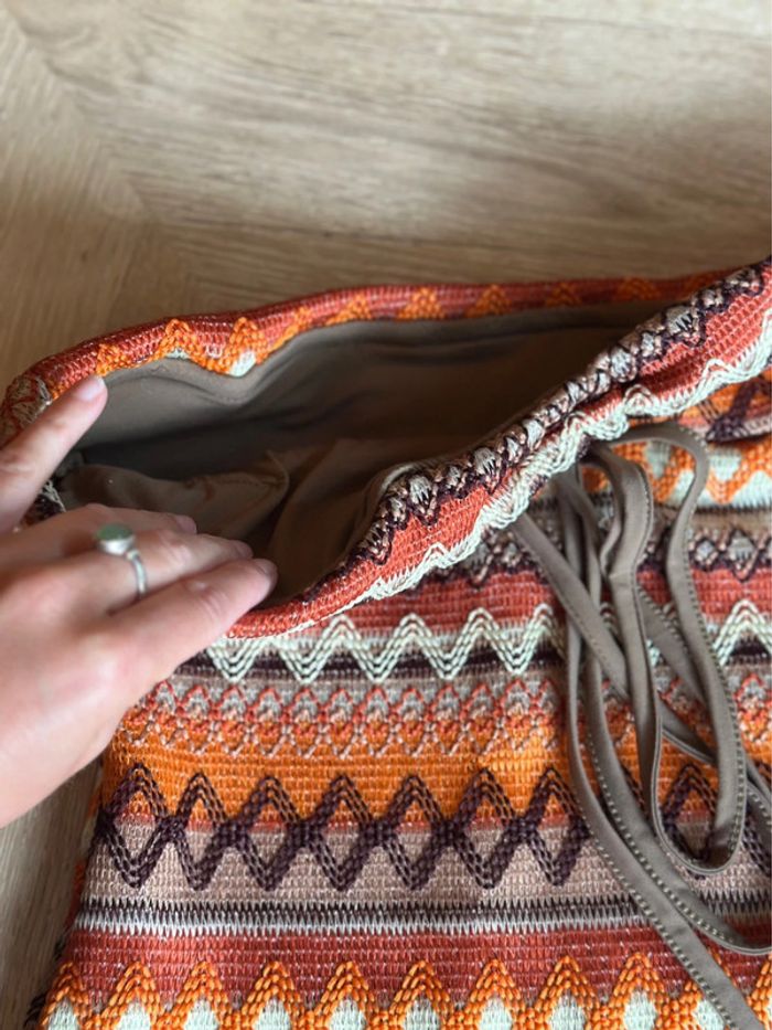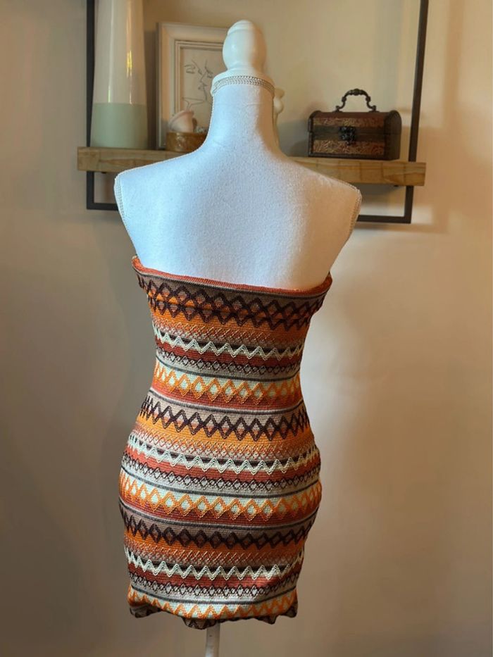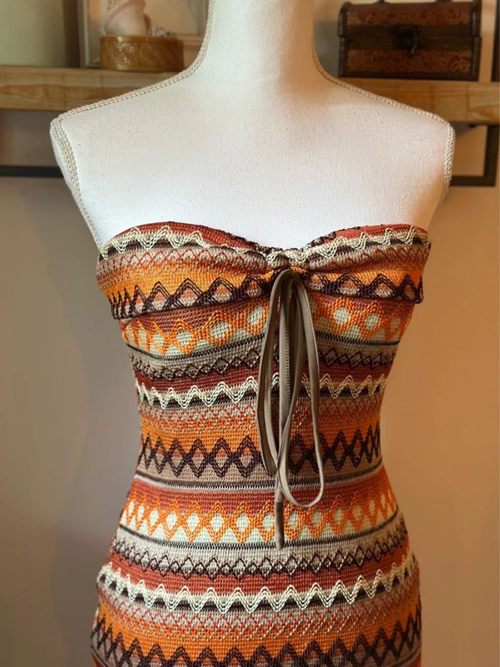 Robe d’été près du corps avec un joli motif ethnique coloré dans les tons orange, crème, beige et marron. Le bustier maintient bien la poitrine et les liens sont ajustables : à nouer devant ou à passer autour du cou selon le style souhaité. Tissu extensible et agréable à porter. Taille 36, convient aussi à un 34 sans souci. État impeccable, comme neuve, portée une seule fois. Parfaite pour un look estival original et féminin !