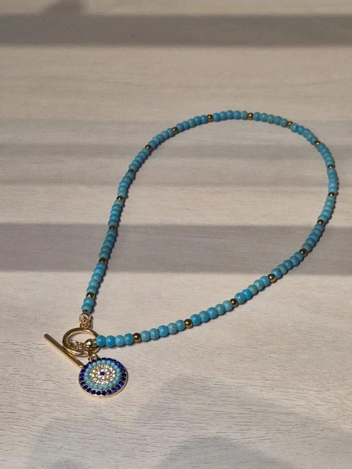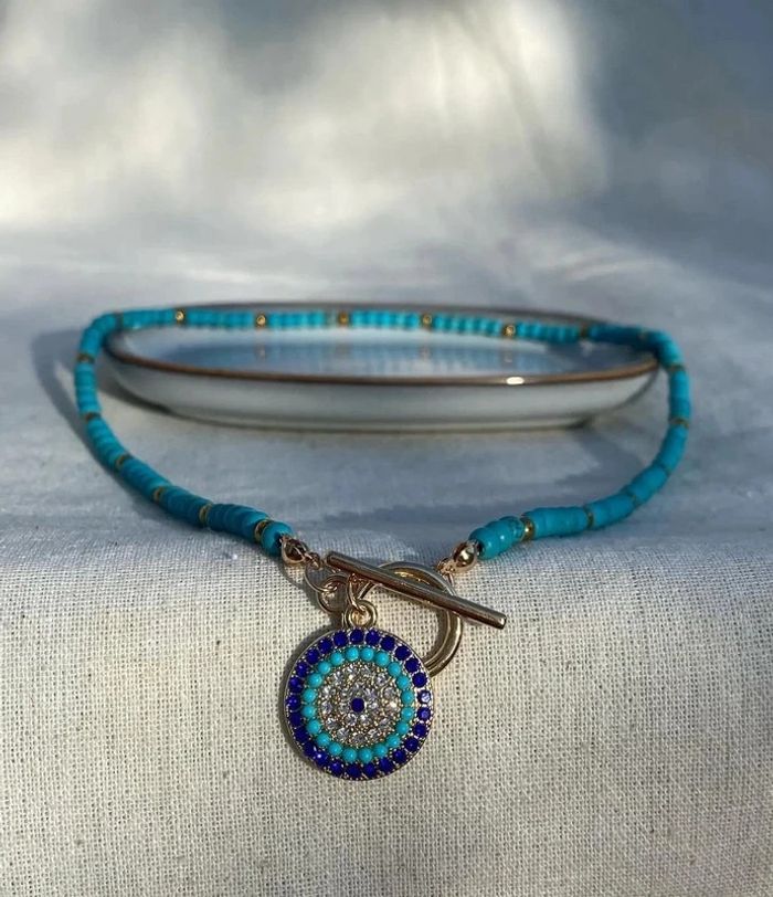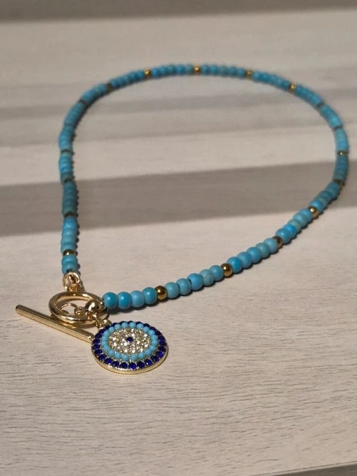 Collier tendance en perles bleues avec pendentif protecteur doré. Fermoir en T très pratique et élégant. 🩵 • État : neuf, jamais porté • Matière : acier inoxydable (résiste à l’eau, ne noircit pas) • Longueur : 40 cm • Style bohème chic, parfait pour l’été ou pour ajouter une touche colorée à votre tenue. ℹ️ Le prix est fixe et il n'est pas éligible à la remise.