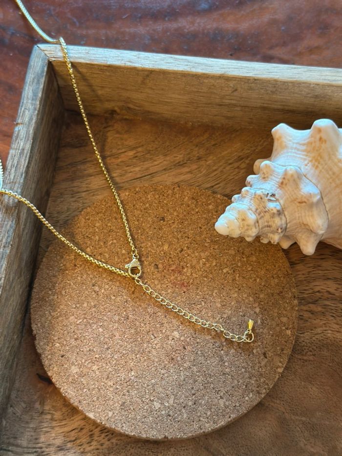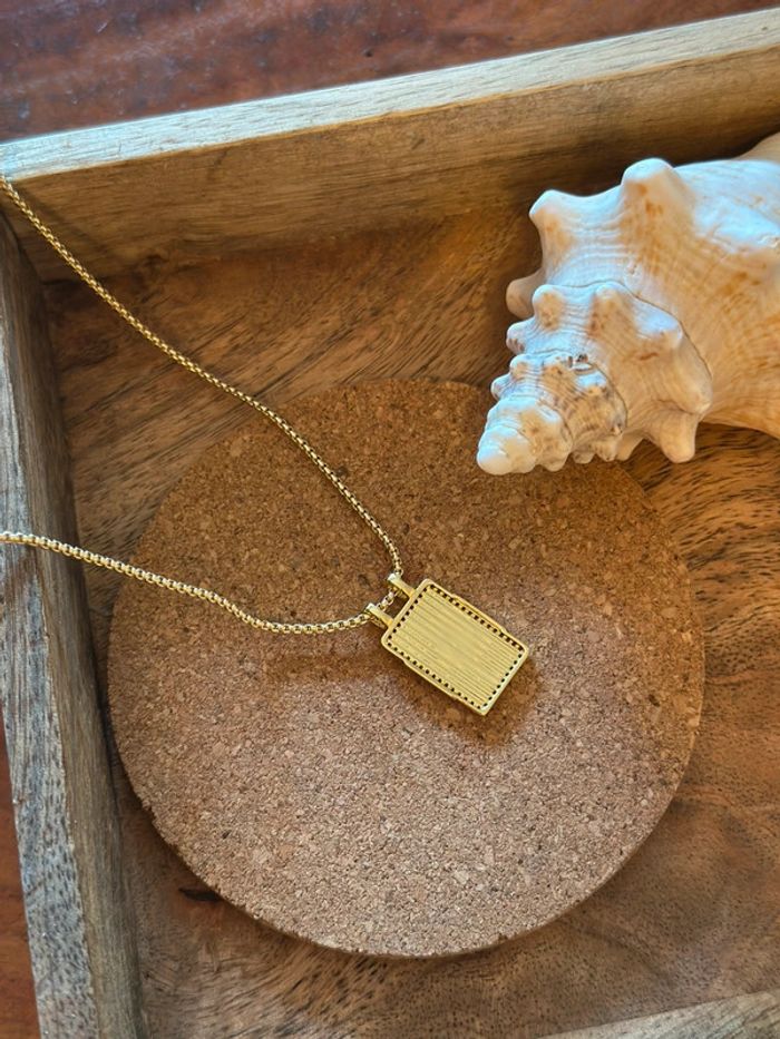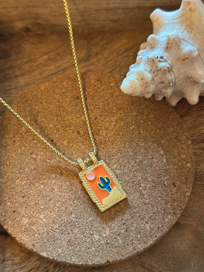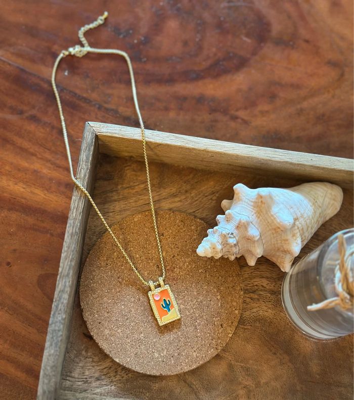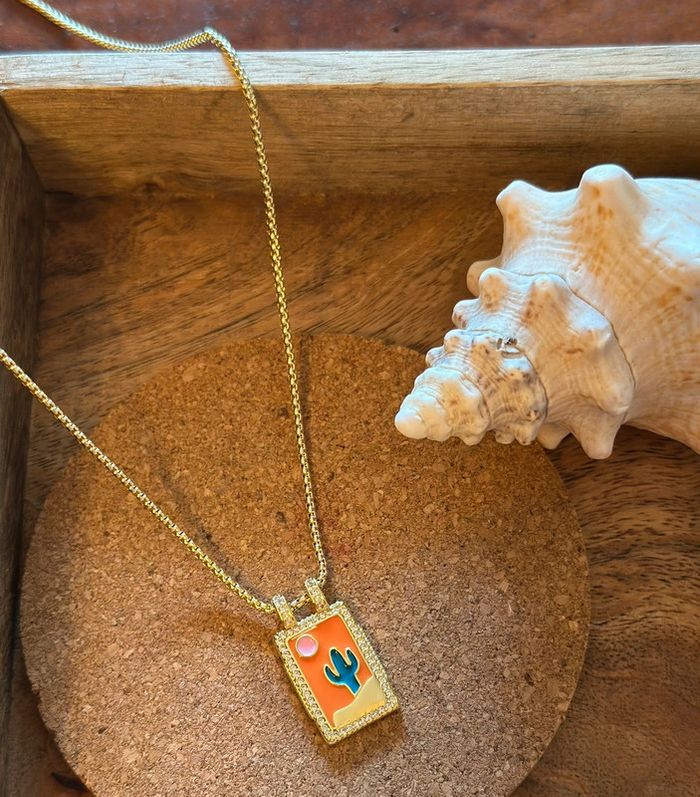 Collier doré pendentif rectangulaire – design coloré (cactus, soleil)