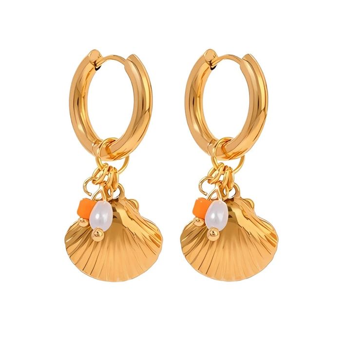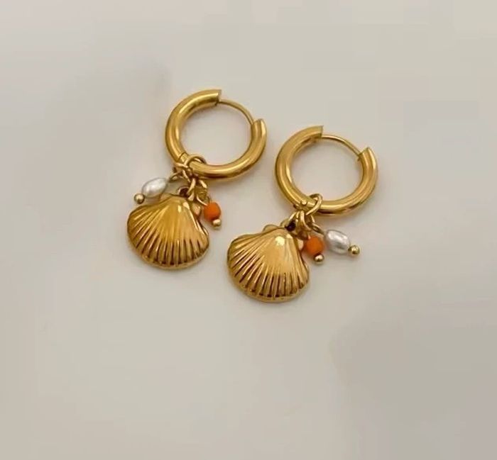 Élégantes créoles dorées en acier inoxydable, ornées d’un pendentif coquillage brillant et de petites perles décoratives (blanche & orange). Un bijou à la fois tendance et délicat, parfait pour sublimer un look estival ou bohème. • Matière : Acier inoxydable plaqué or • Taille : env. 3,5 cm de long / anneau : 1,5 cm • Poids : 10 g la paire • Hypoallergéniques & résistantes à l’eau • État : neuf / jamais portées Idéales à offrir ou à s’offrir pour une touche dorée et solaire au quotidien !
