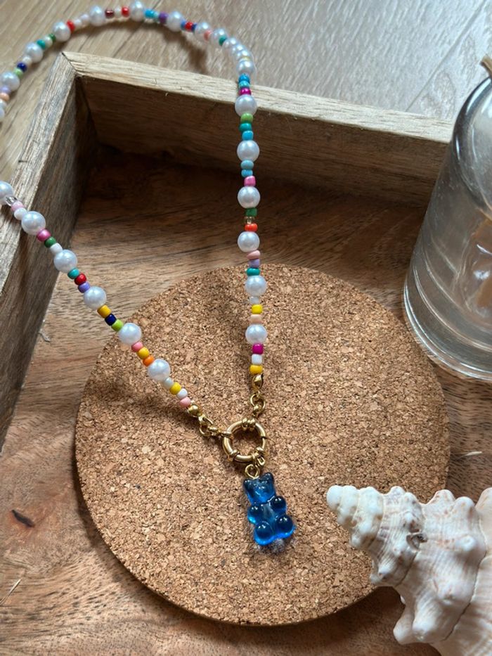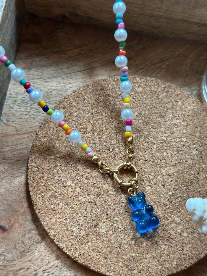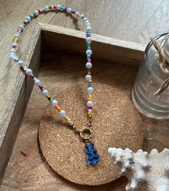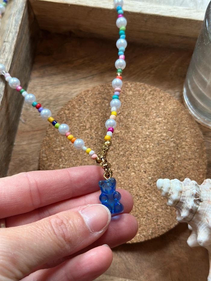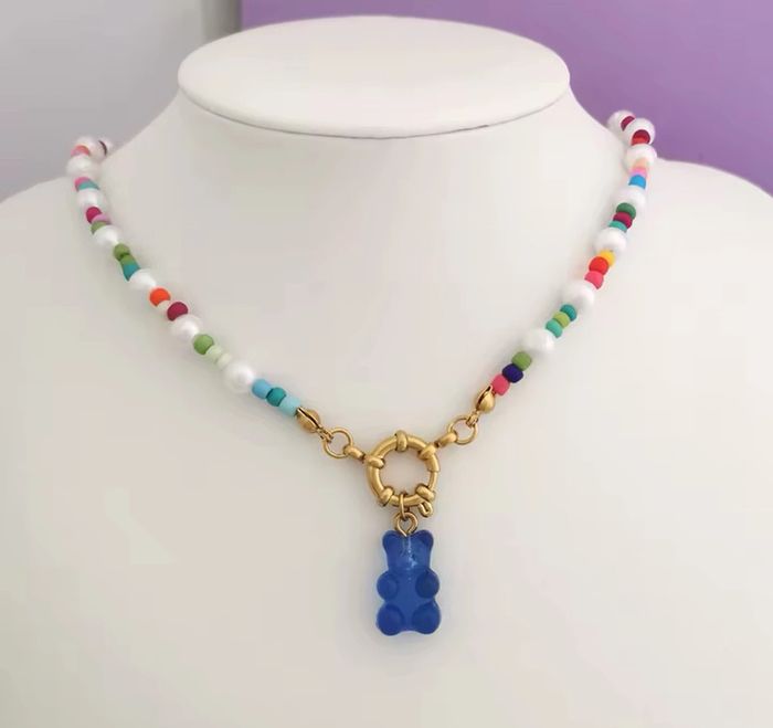 Collier perles colorées & pendentif ourson bleu – Acier inoxydable, style bonbon - photo numéro 1