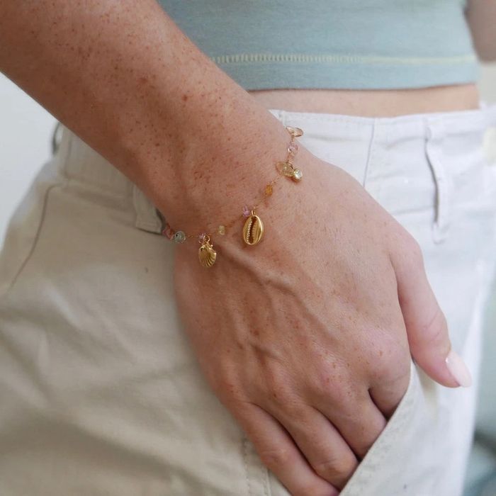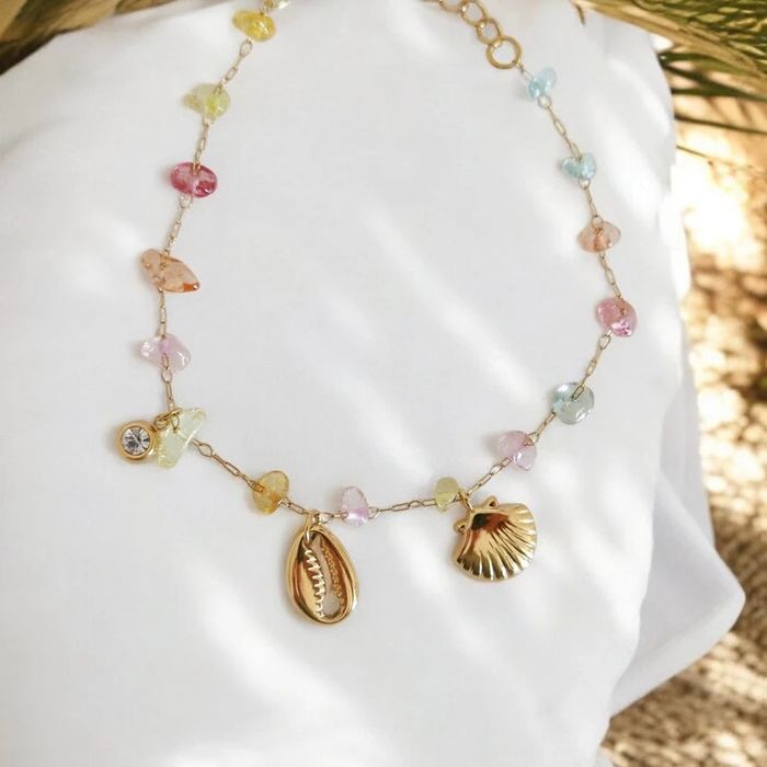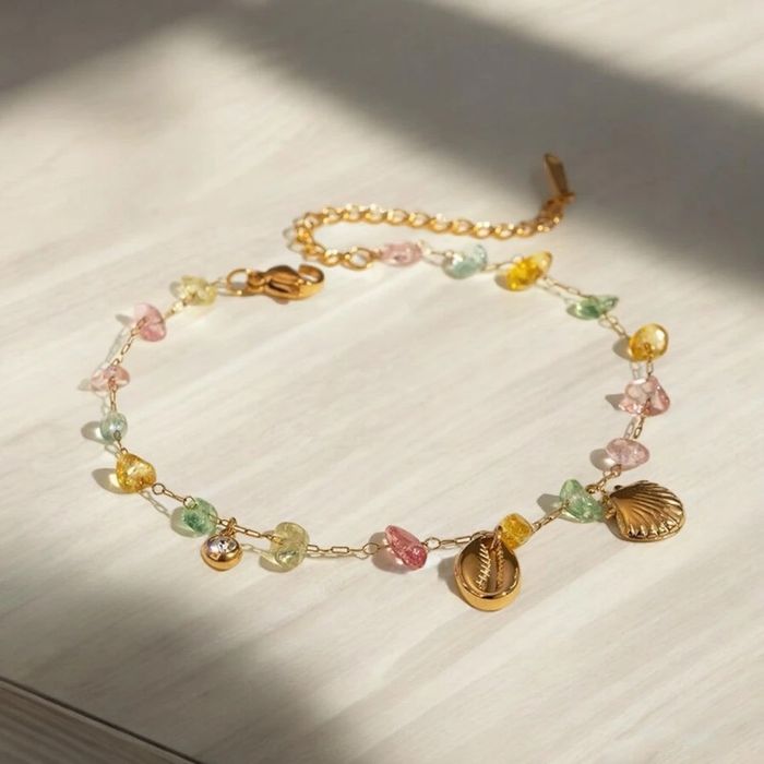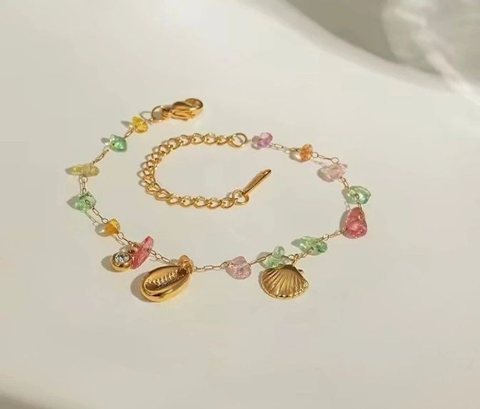 Bracelet fin doré en acier inoxydable avec pierres colorées et coquillages (neuf) - photo numéro 1