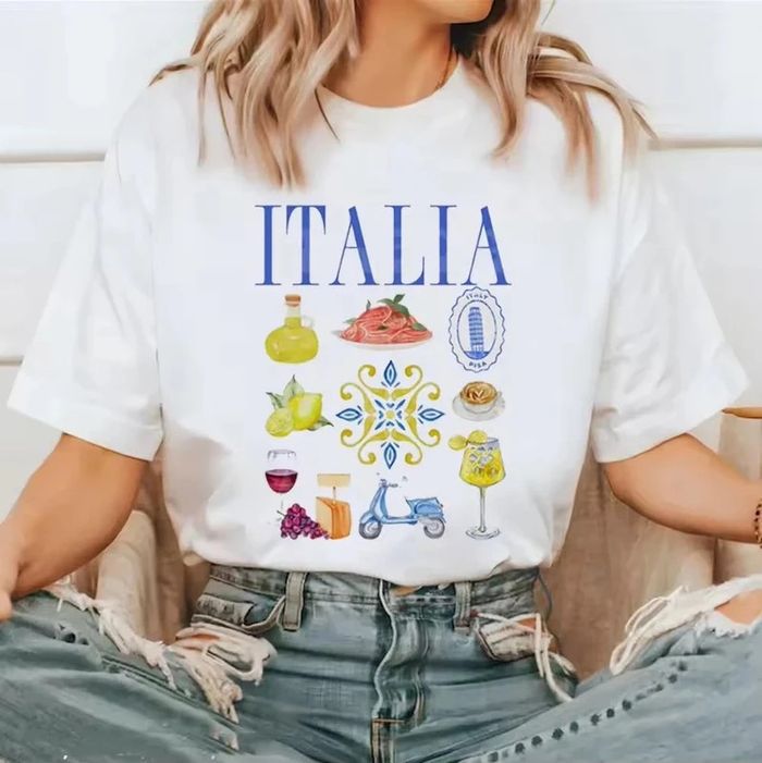 Joli t-shirt en coton doux, imprimé avec des motifs inspirés de l’Italie colorée 🇮🇹. Comme neuf, la taille S convient bien. Coupe oversize, ok pour S/M. ℹ️ Le prix est fixe et il n'est pas éligible à la remise.