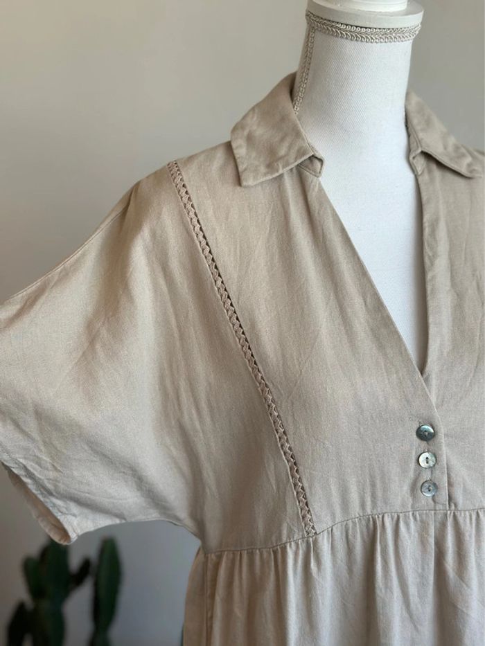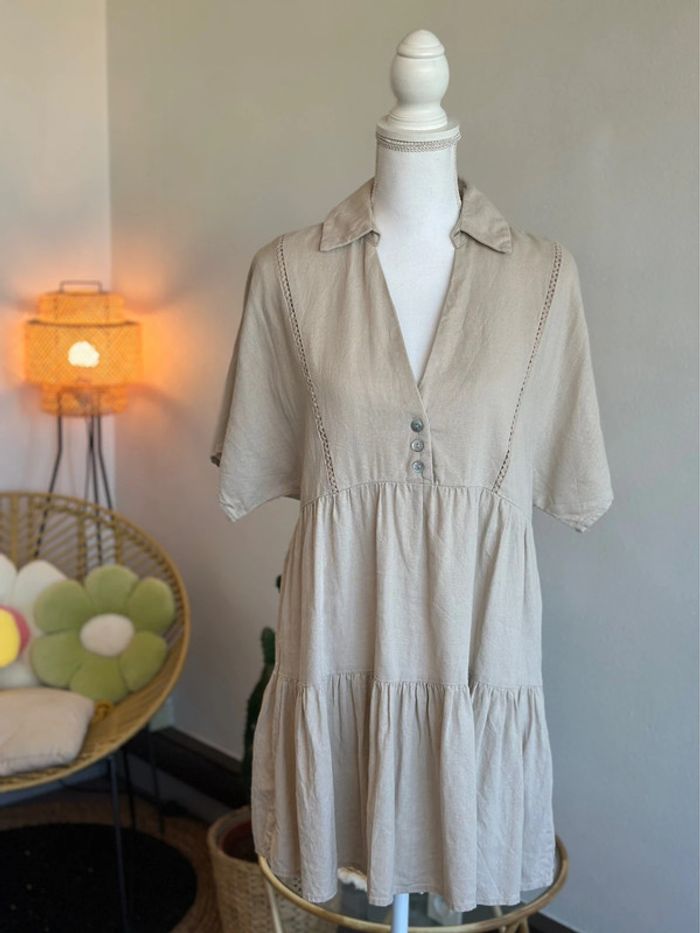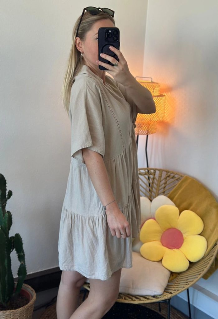 Prix d’achat : 49,95 €. Neuve avec l’étiquette. Cette charmante robe à coupe babydoll se présente en couleur beige, confectionnée dans un mélange de lin et de coton de qualité. Elle possède de jolis détails, notamment des boutons nacrés. La taille XS s’ajuste parfaitement et convient également pour un XS/S. ℹ️ Le prix est fixe et il n'est pas éligible à la remise. 📏 Je mesure 1m60, 47-48kg, t34,36, p36 💌 N’hésite pas à t’abonner si tu souhaites être la première avertie des prochaines pépites & suis la boutique sur instagram pour ne rien louper.