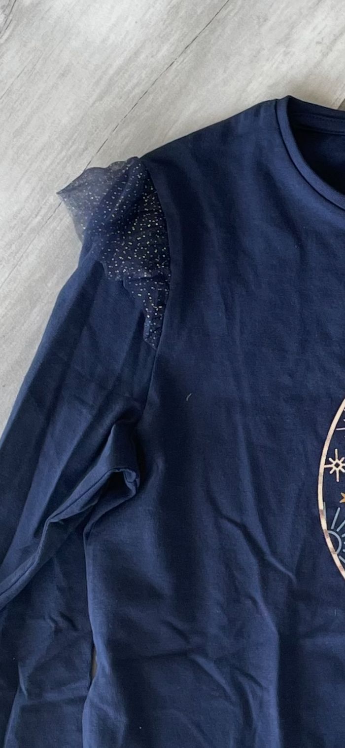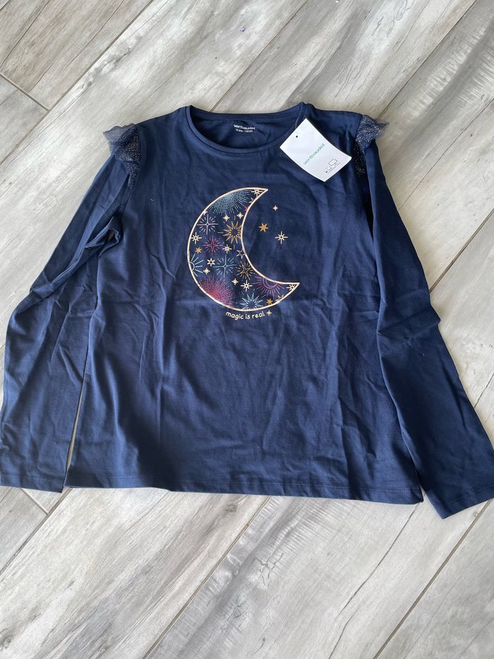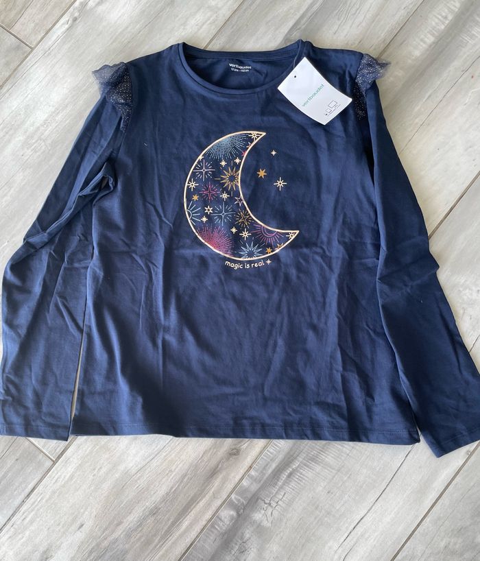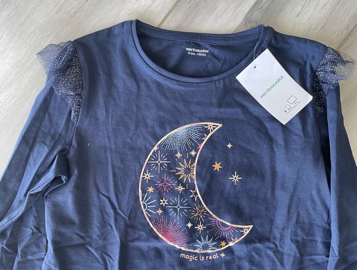 Beau Tee-Shirt T 12 ans Vert Baudet avec dessin lune dorée Couleur bleu marine avec joli dessin lune doré Manches longues avec volant tulle paillettes dorées en haut des manches Neuf avec étiquette