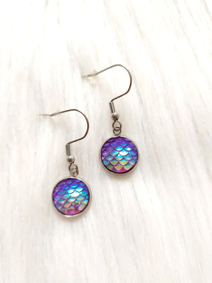 Boucles d'oreilles pendantes rondes écailles de sirène violet irisé