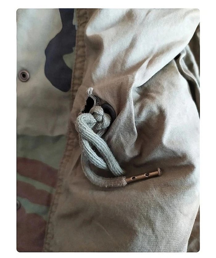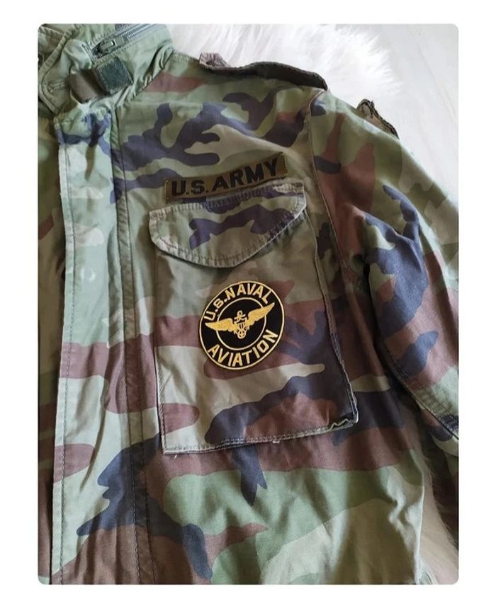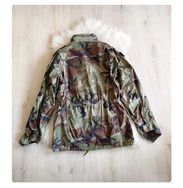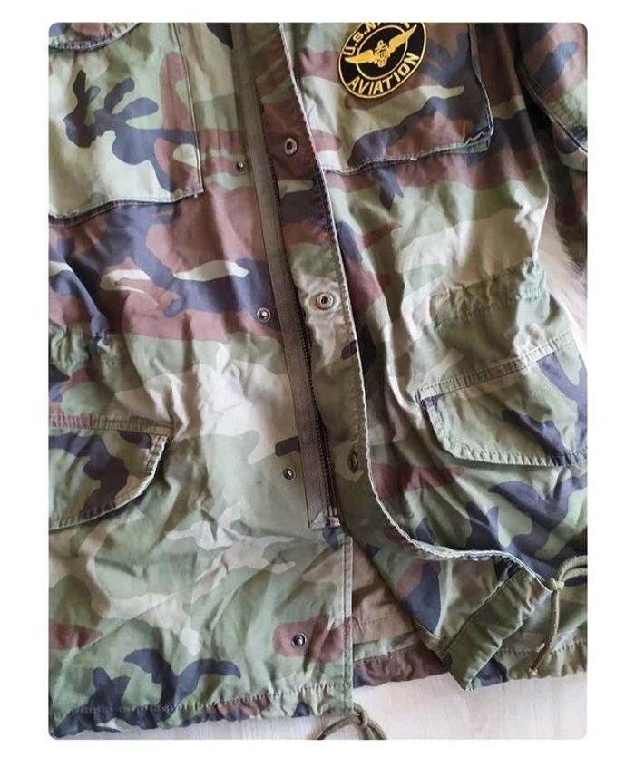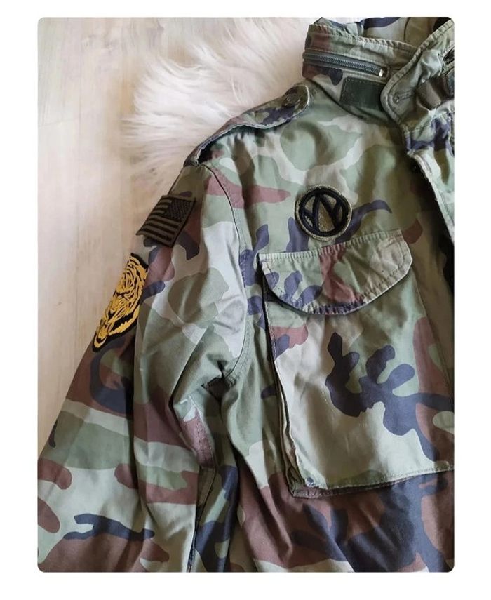 #vklhomme #vklvestes Veste parka militaire US Army imprimé camouflage Correspond à une taille M. En coton, avec fine doublure coton. Customisée avec écussons. Convient pour mi-saison. Largeur épaules à plat 59 cm, aisselles 51 cm. Longueur 79 cm. Le trou d'un des liens de resserrage à l'intérieur de la veste est un peu abîmé, voir avant-dernière photo. 🛒🛒 US Army military parka jacket with camouflage print Militärparka-Jacke der US-Armee mit Tarnmuster