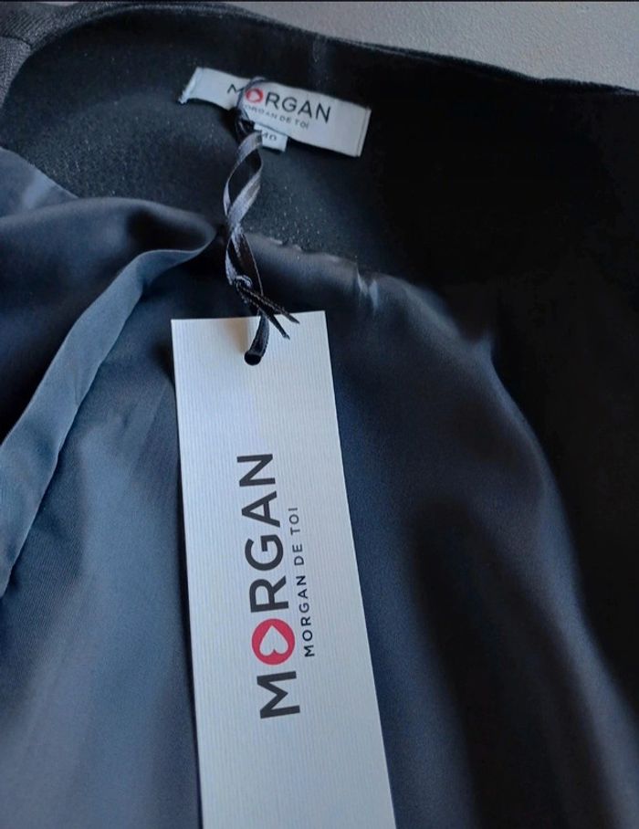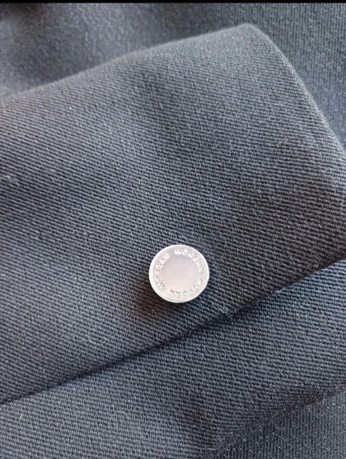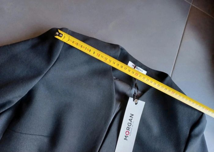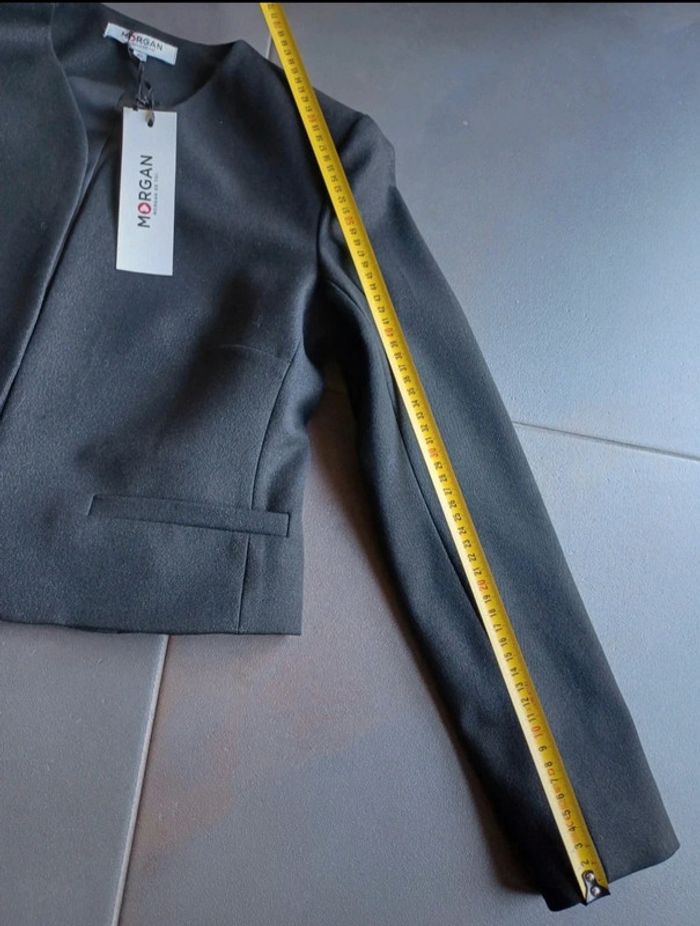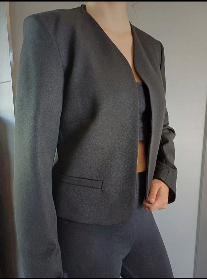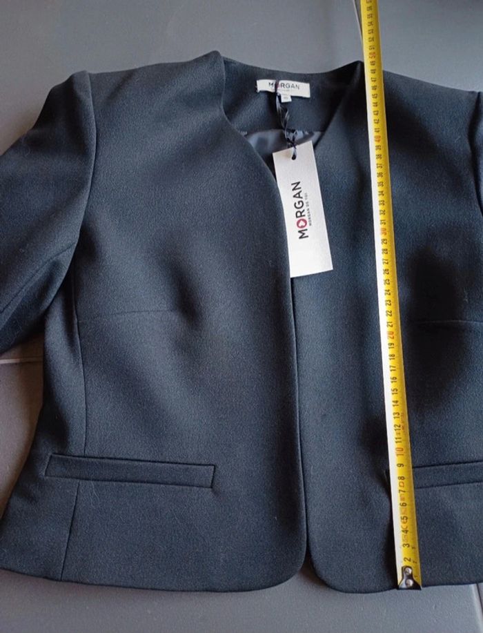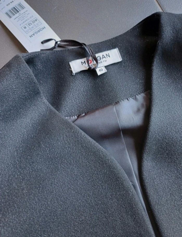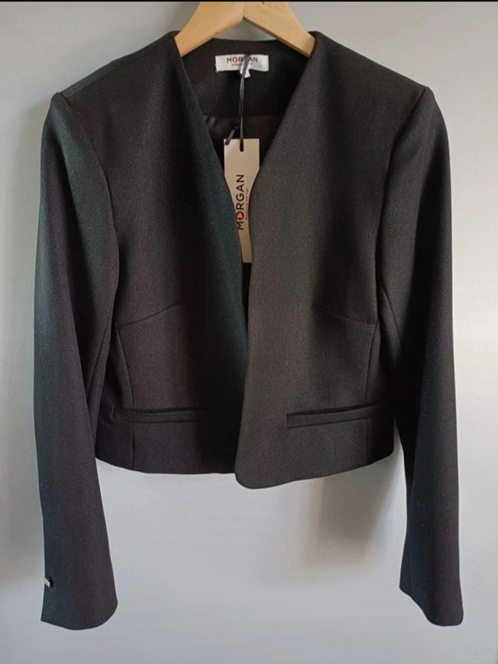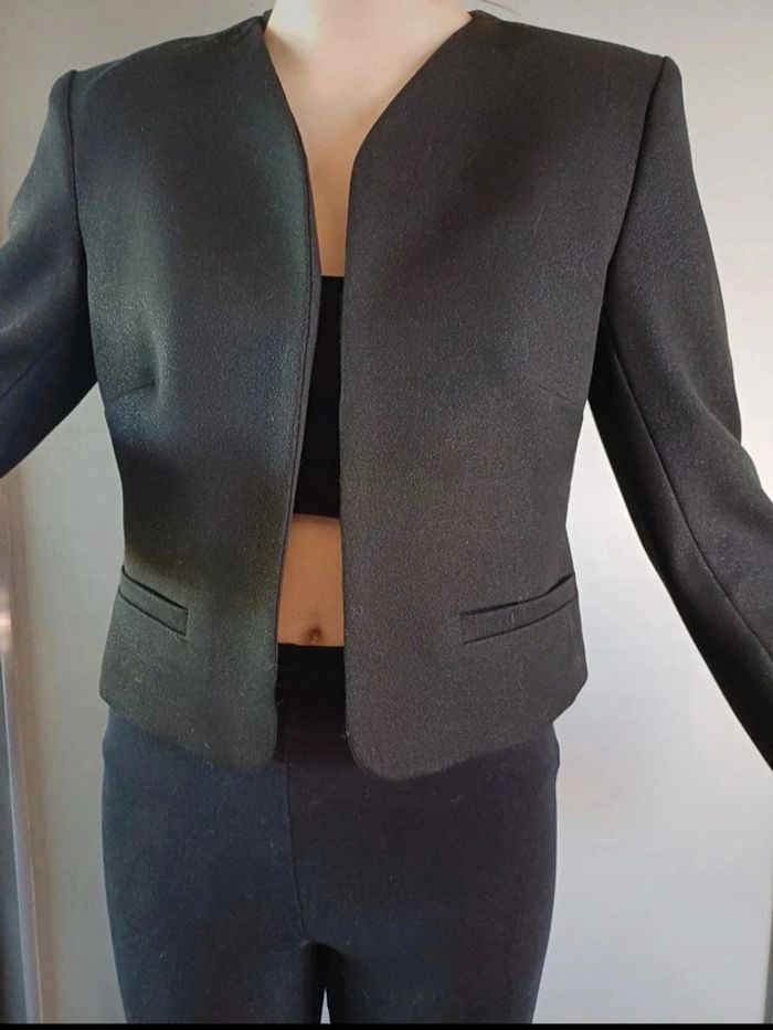 Petite veste noire. Manches longues Légèrement pailletée 2 fausses poches sur le devant Encolure en V. Bouton manche