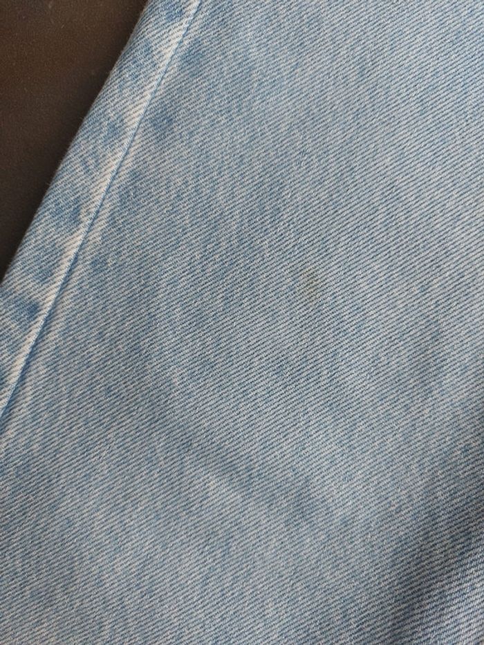 Jean bleu clair coupe mom 4 poches fermeture zippée boutonnée petite tache sur le genou gauche : voir photo