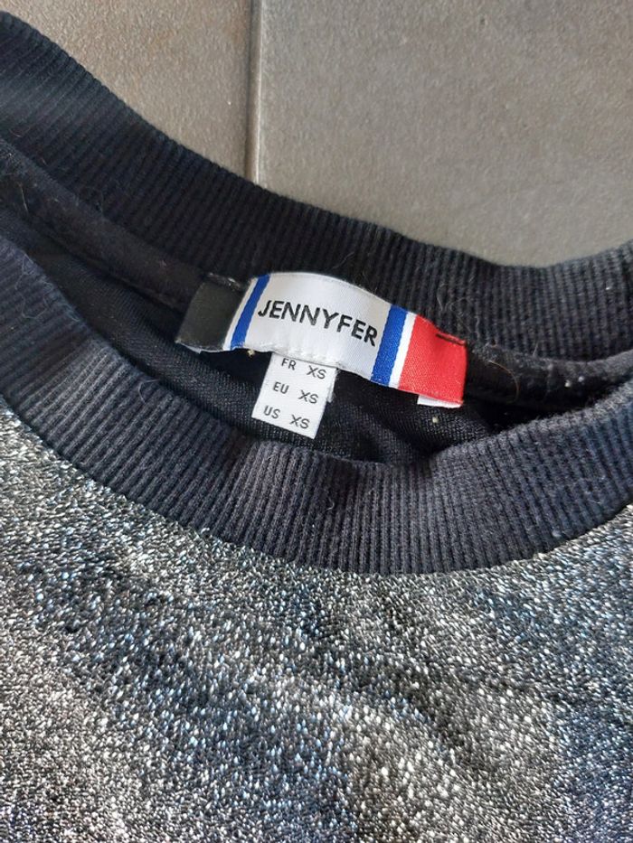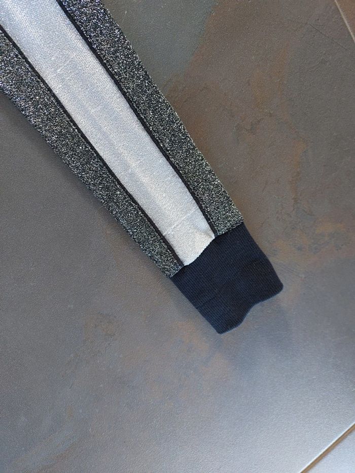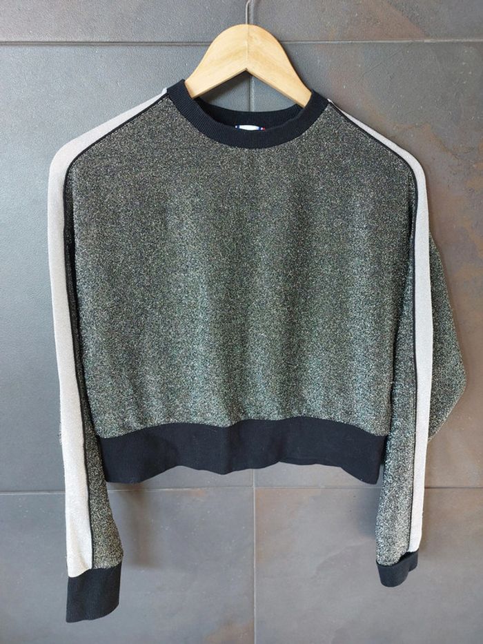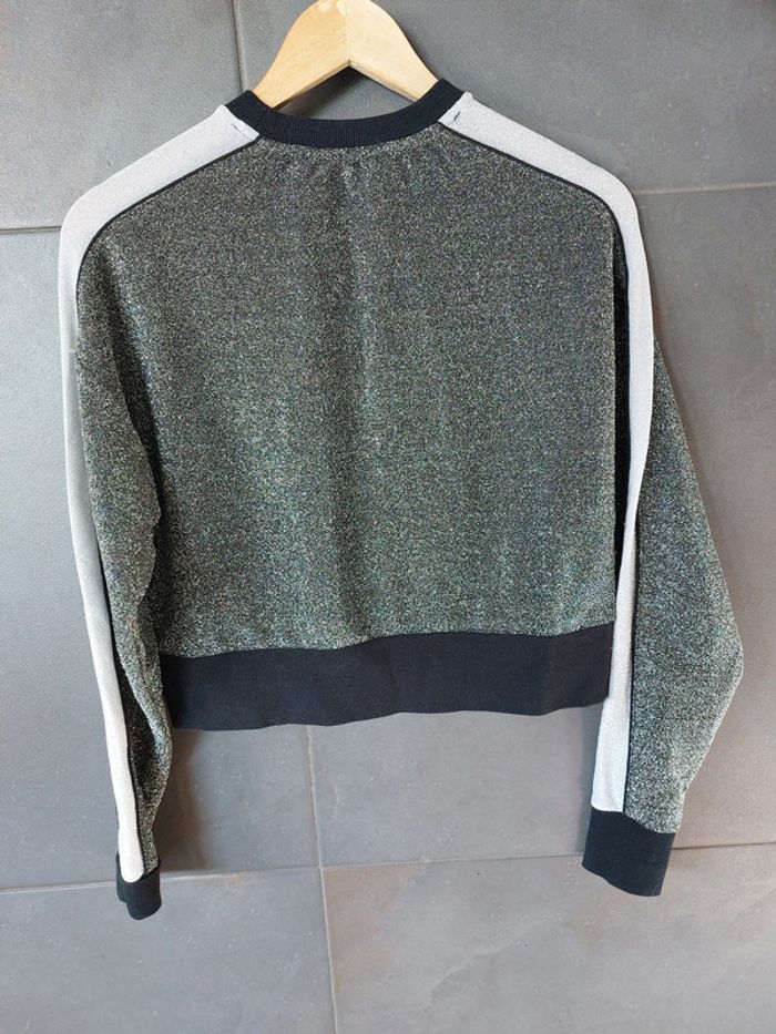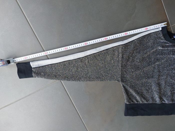 pull gris foncé brillant avec large bande grise sur le dessus des manches. Longueur environ 46cm.