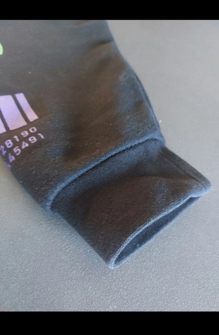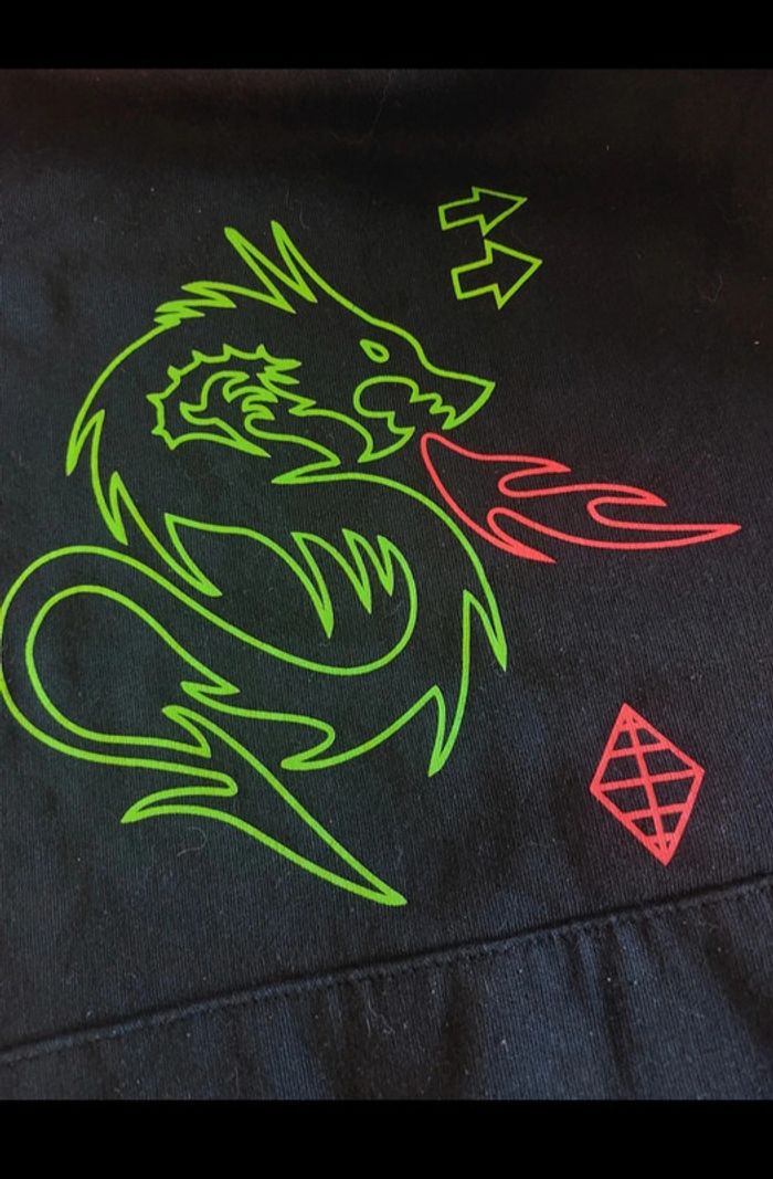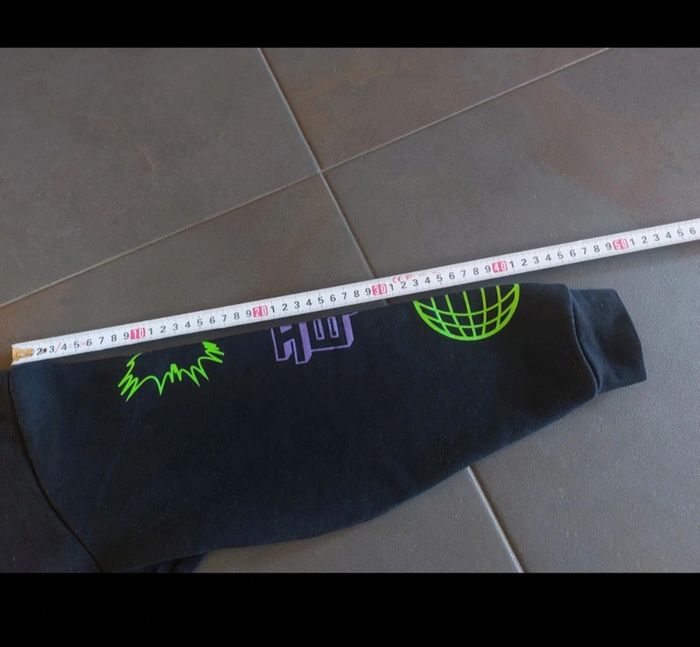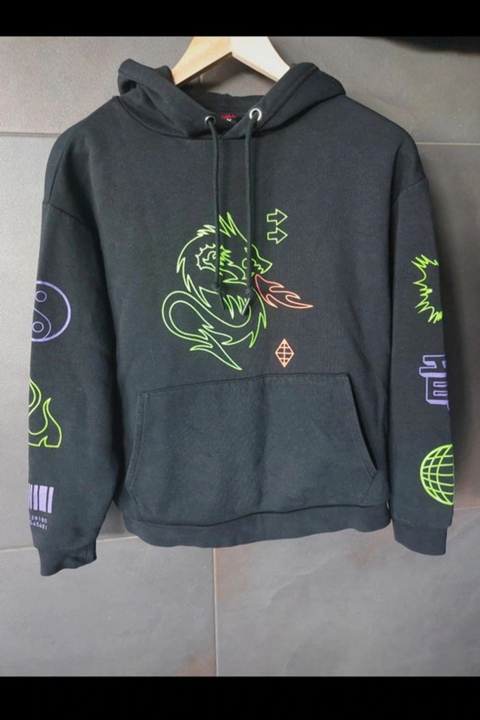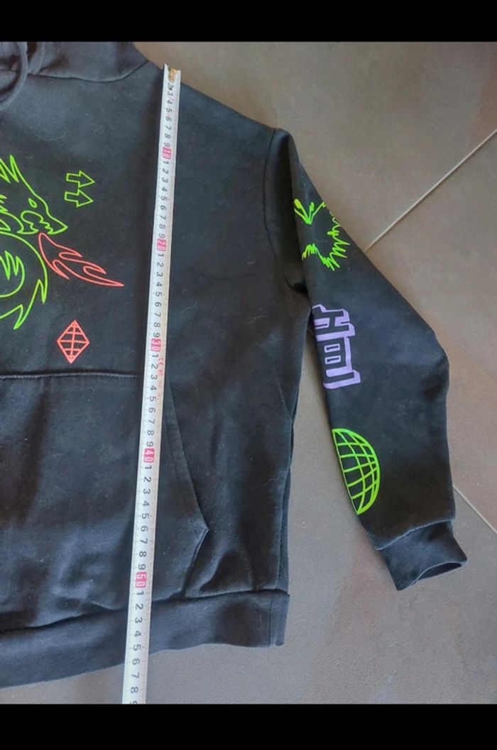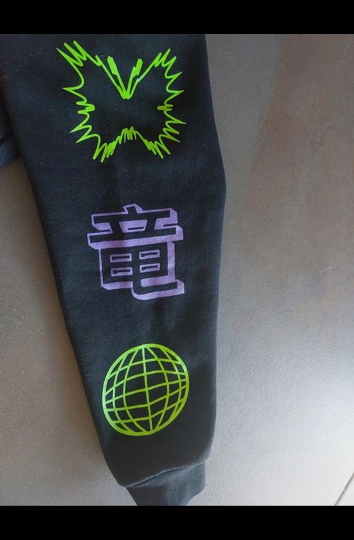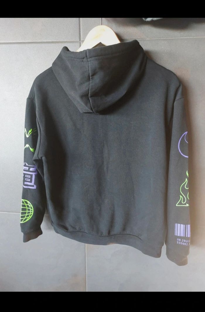 Capuche avec lien. Poche ventrale. Nombreux dessins fluo.