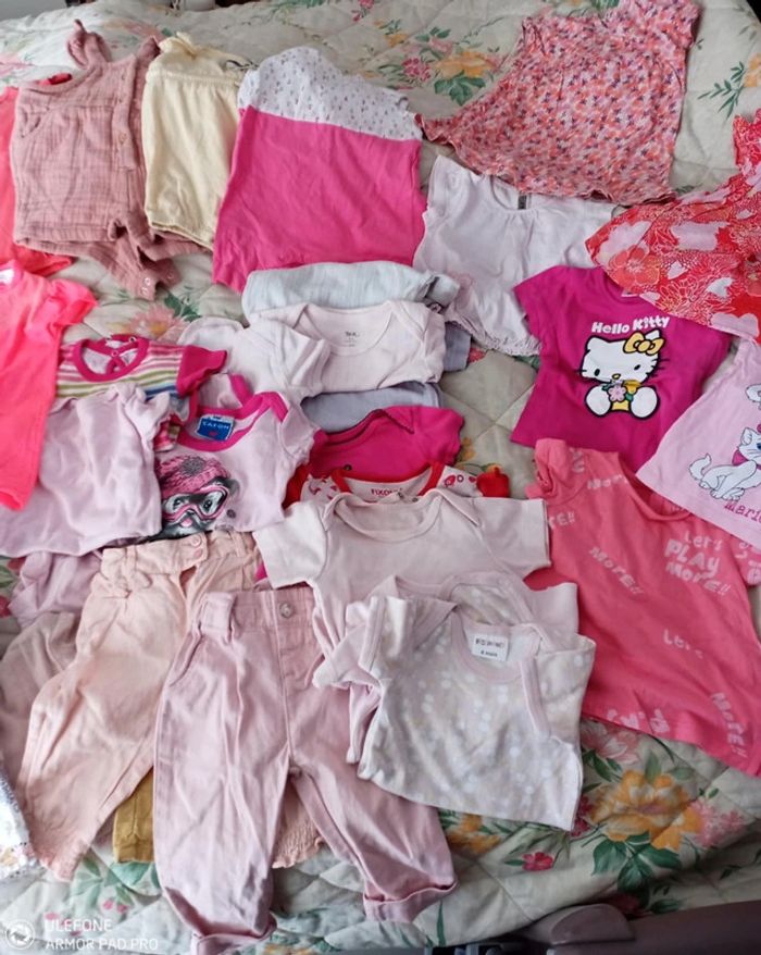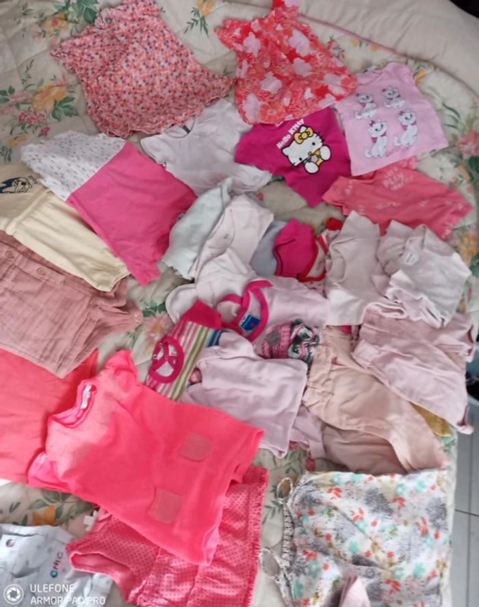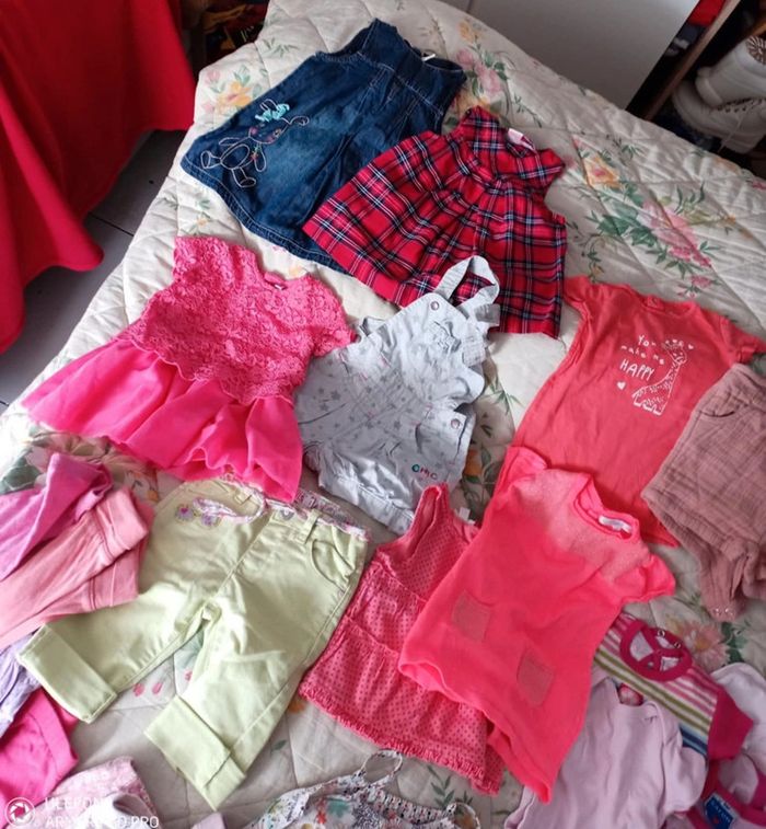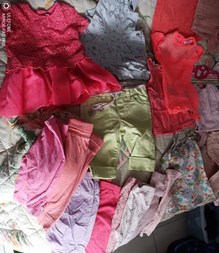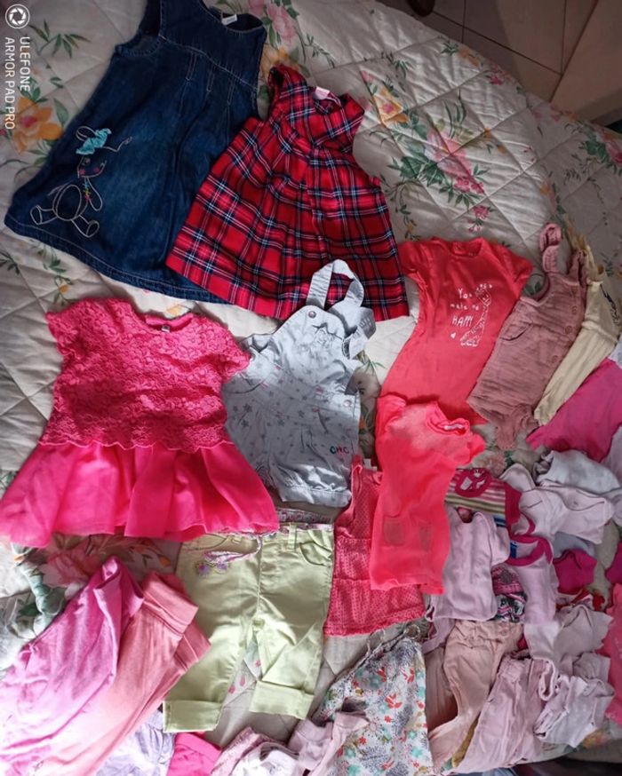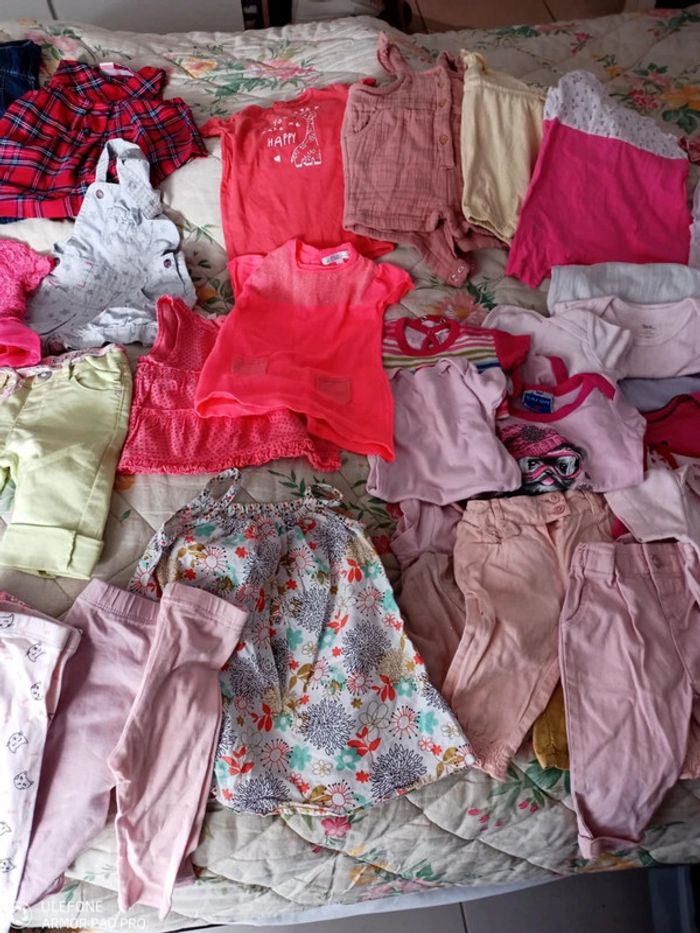 Lot de 40 pièces 6 robes 4 combishort 1 salopette short 13 bodies manches courtes 6 t shirts 4 pantalons 7 leggins 1 pantacourt 1 blouse Plusieurs marques , kiabi. H&m, etc