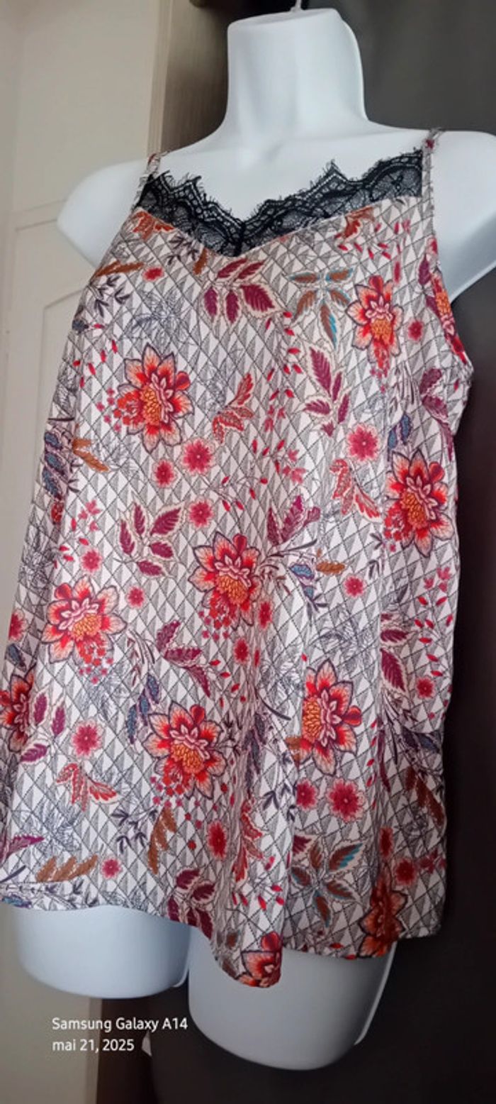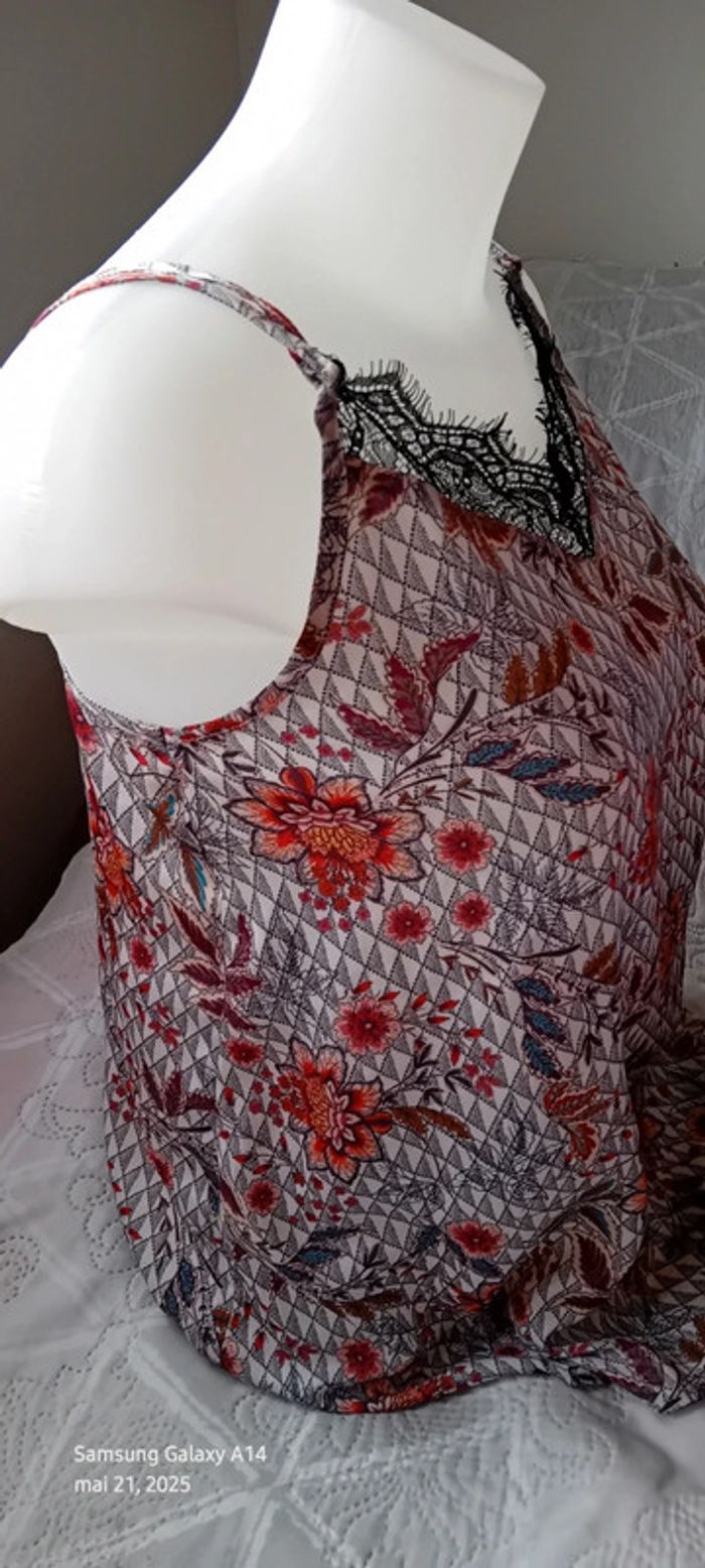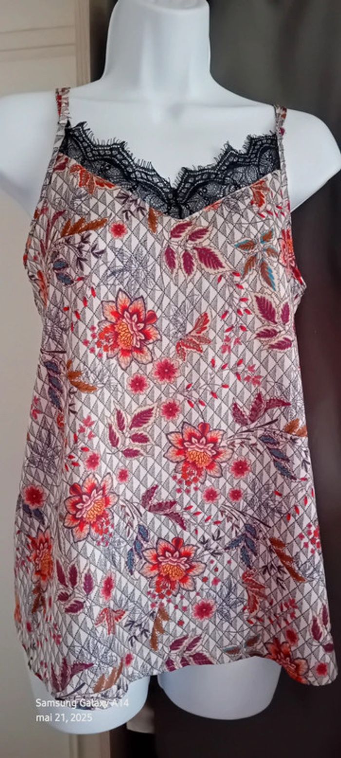 Top fines bretelles en polyester et polyamide matière fluide et légère décolleté en V avec dentelle noire imprimé fleurs avec losanges longueur 64 cm largeur aisselles à aisselles 43 cm peu porté en très bon état #midole #midolefemme #midolefemme36 #midolefemmeS #femme36 #femmeS #topépaulesdénudées #hautété #motiffleuri #topfinesbretelles36 #hautavecdentelles #hautmotiffleurs #motiflosanges