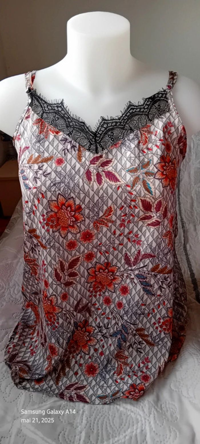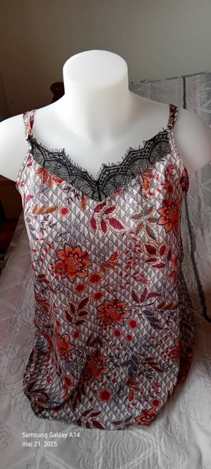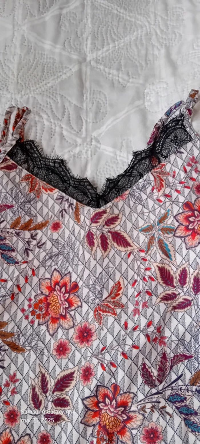 Top fines bretelles en polyester et polyamide matière fluide et légère décolleté en V avec dentelle noire imprimé fleurs avec losanges longueur 64 cm largeur aisselles à aisselles 43 cm peu porté en très bon état #midole #midolefemme #midolefemme36 #midolefemmeS #femme36 #femmeS #topépaulesdénudées #hautété #motiffleuri #topfinesbretelles36 #hautavecdentelles #hautmotiffleurs #motiflosanges