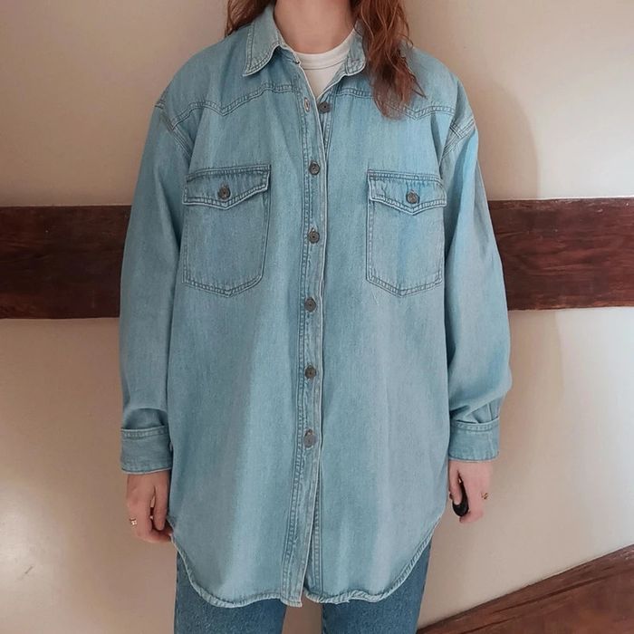 💐 Réductions sur les lots 💐 2 articles : -5% 3 & 4 articles : -10% 5 articles et plus : -15% ⚠️ Pas d'envoi Vinted go, merci Étant une entreprise déclarée payant des charges, merci de respecter mon travail en ne le bradant pas 🙏 ✨ Chemise ou surchemise oversize en jean bleu clair style cowboy western Seteloli, années 90 100% coton toile jean légère Très bon état Taille 40 Je la porte sur un 36 sur les photos et mesure 1m61 📏 Dimensions à plat : carrure 50cm, largeur poitrine 52cm, longueur 78cm #desibellesfripes40