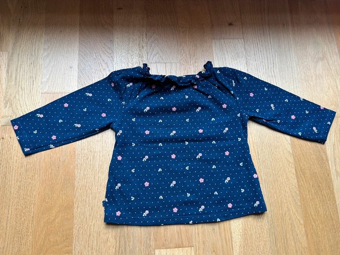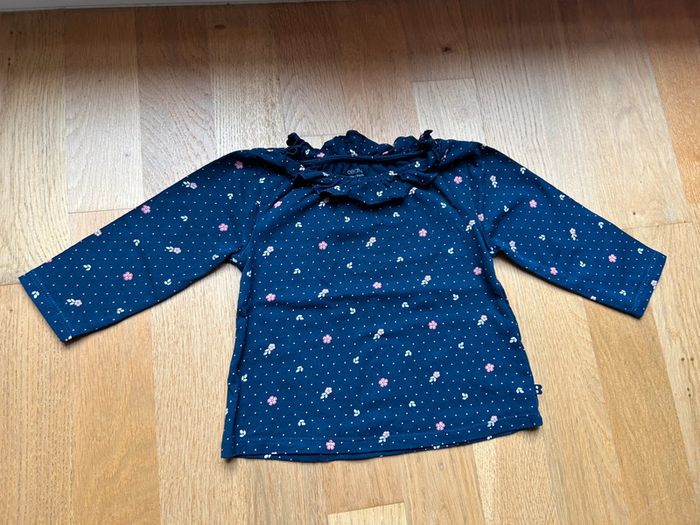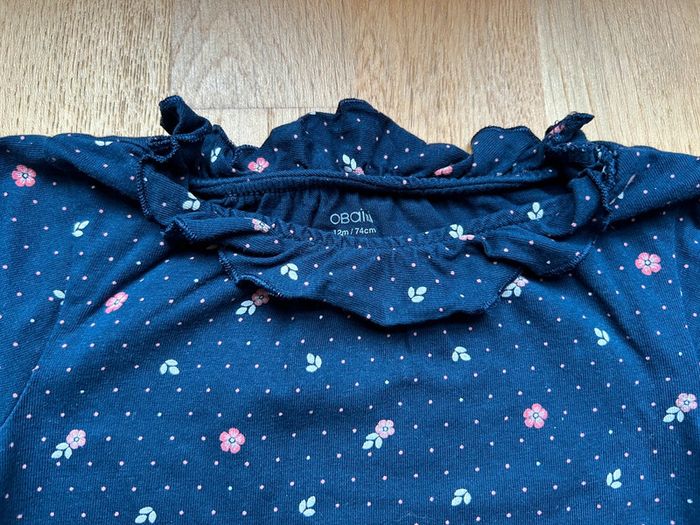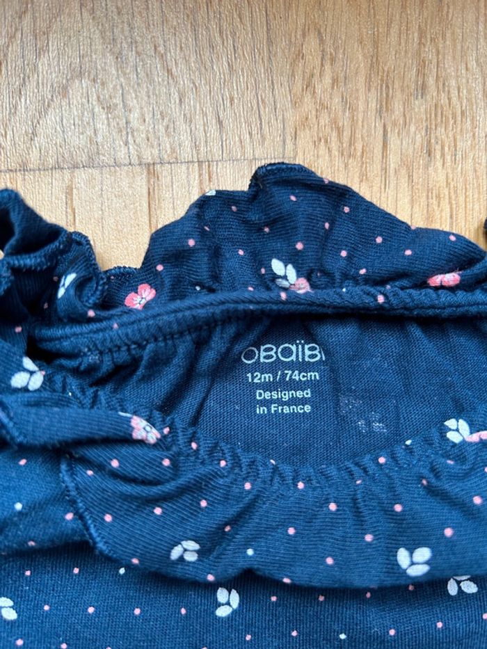 Marque: obaïbi Taille: 12 mois Couleur: marine-blanc-rose Particularité: Manches longues Col volanté Motif fleuri Lavé et repassé État: neuf sans étiquette