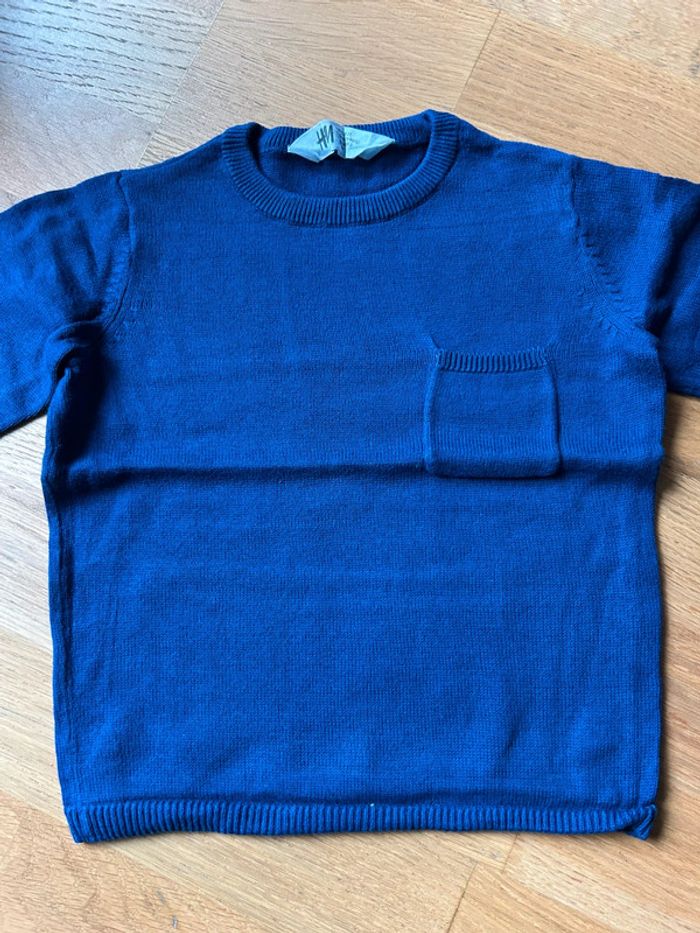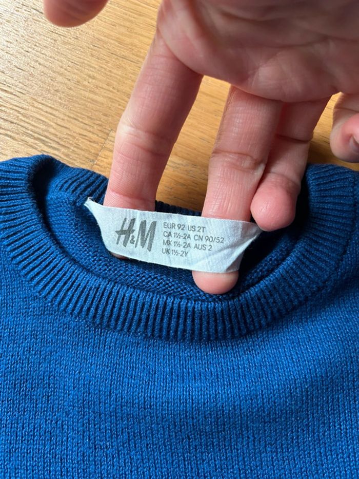 Marque: H&M Taille: 1 an 1/2 2 an 92 cms Couleur: bleu électrique Particularité: Pull fin Poche à la poitrine Lavé et repassé État: neuf sans étiquette ⚠️ n’hésitez pas à regarder dans mon dressing pour faire un lot avec d’autres articles-> remise faite avec plaisir sur le tout 💸