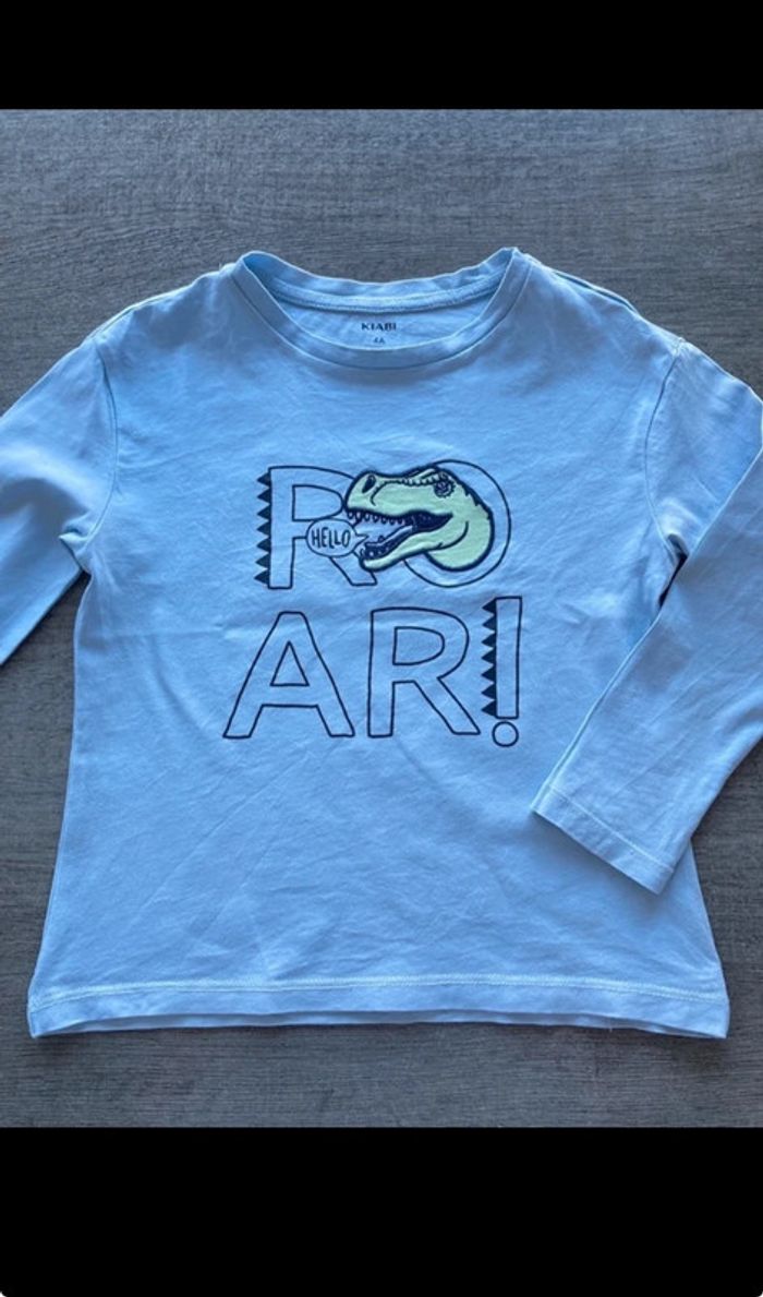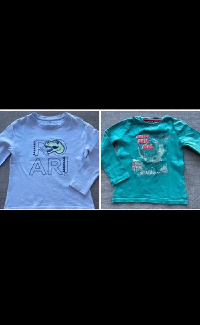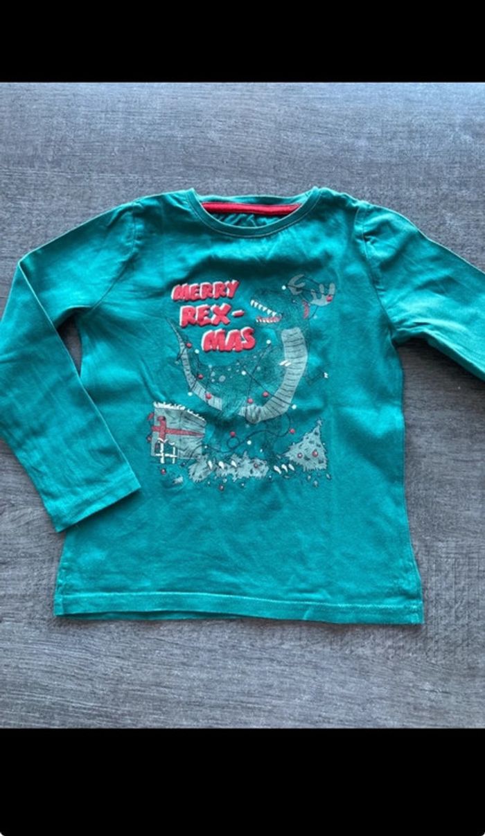 2 tshirts kiabi en 4 ans : 1 vert t-rex de noël 1 bleu t-rex (légère tache et fil un peu décousu) #4ansgarconamd