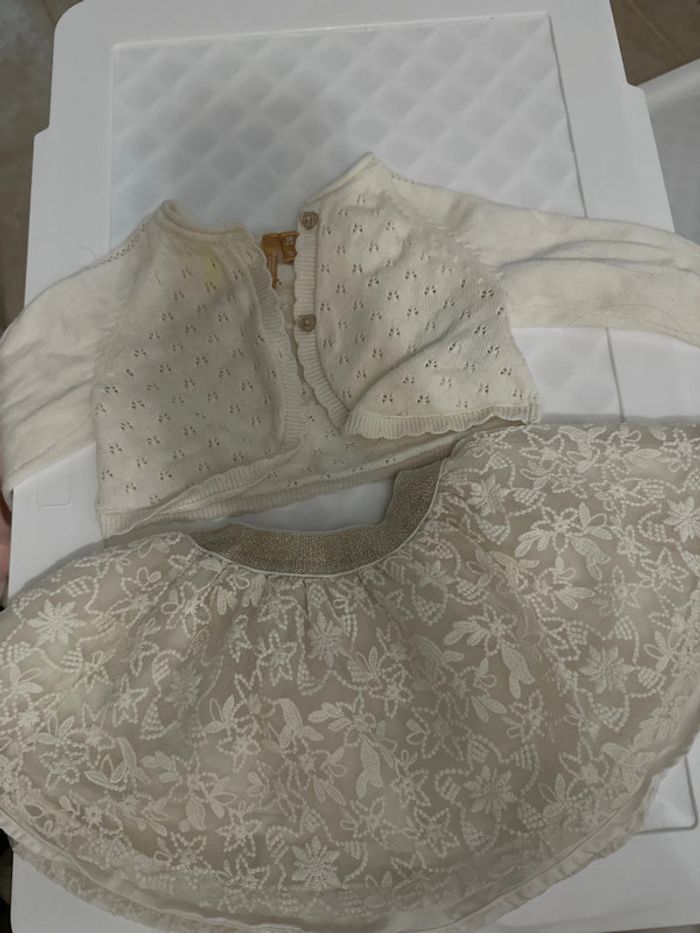 Ensemble Jupe tutu et gilet Utilisé une seule fois pour un baptême Y a une petit tache à côté du col qui peut partir au lavage Marque orchestra Taille 3 mois