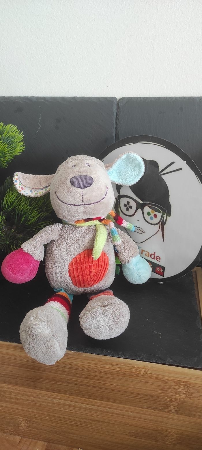 Doudou Mouton chien Gris Bleu Rond Orange Nicotoy rayé pois écharpe vert Peluche