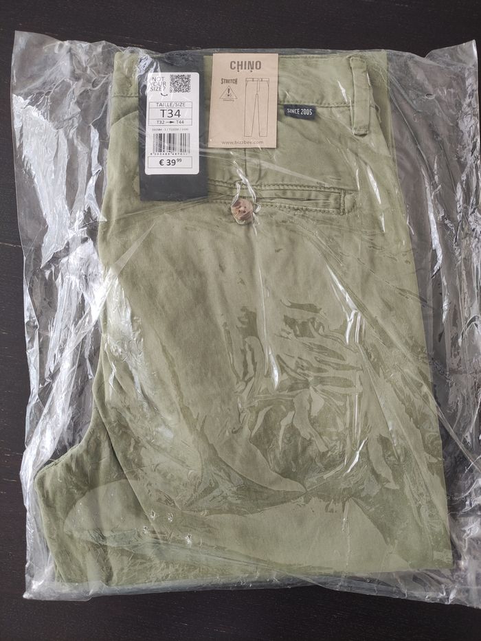 Pantalon Chino homme taille 34, neuf sous blister jamais porté. Couleur vert. Stretch.