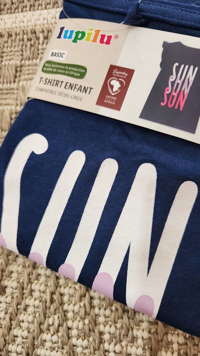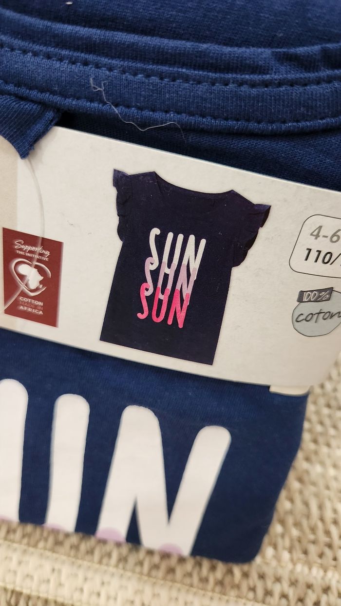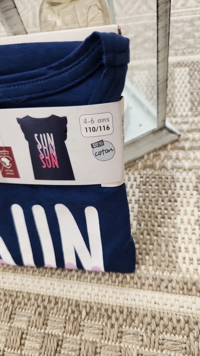 Tee Shirt Fille Lupilu 5/6ans 110/116 Bleu Marine avec écritures Manches courtes élégante 100% Coton Neuf étiquette 🏷 Pensez au lot pour des Réductions ☀️