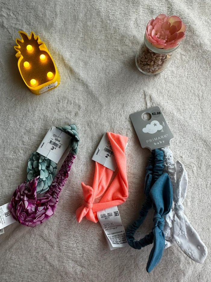Lot de 3 bandeaux 2 de Kiabi un rose et vert, un orange et deux de primark blanc et bleu Neuf avec étiquette Taille : 3-6 mois #3moiskellyz33 #6moiskellyz33