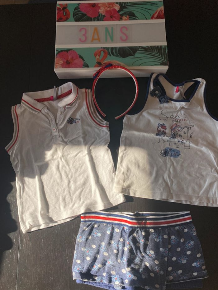 Pour habiller votre fille en parfaite harmonie :) Un total Look - Habit de la meme collection Orchestra Polo Debardeur Jupe/short(décoloré) Serre tête tennis/pois/ orchestra 3 ans #lilylolacloetomgirl3ans #lilylolacloetomgirltotallook