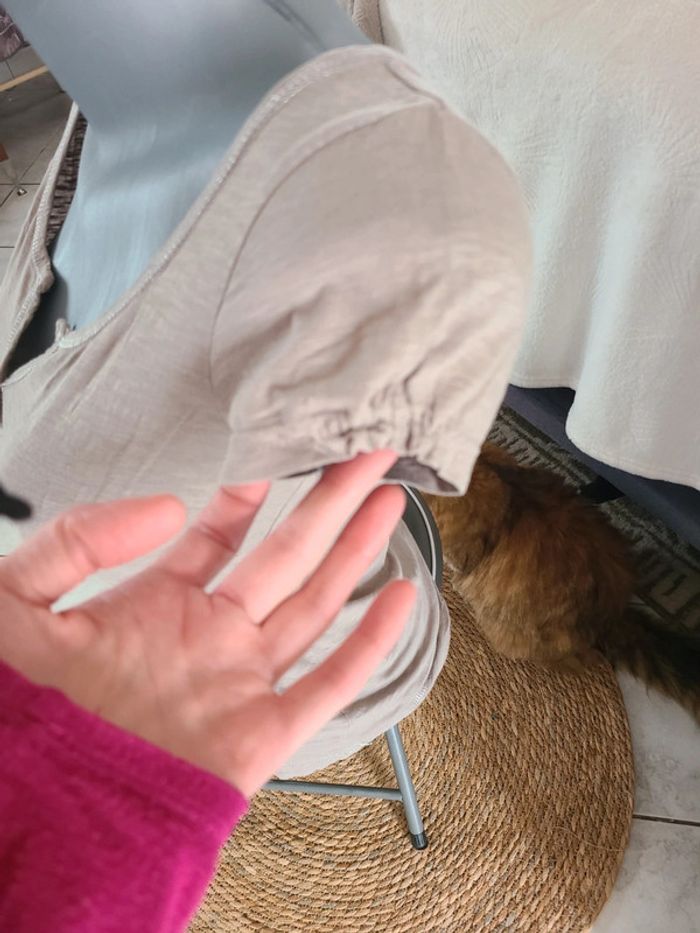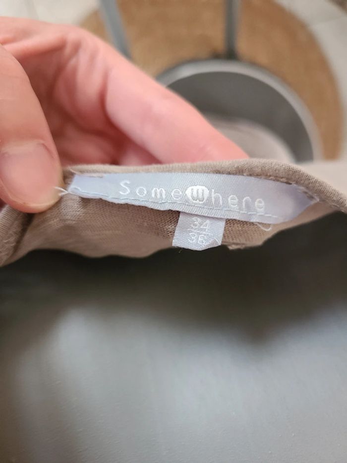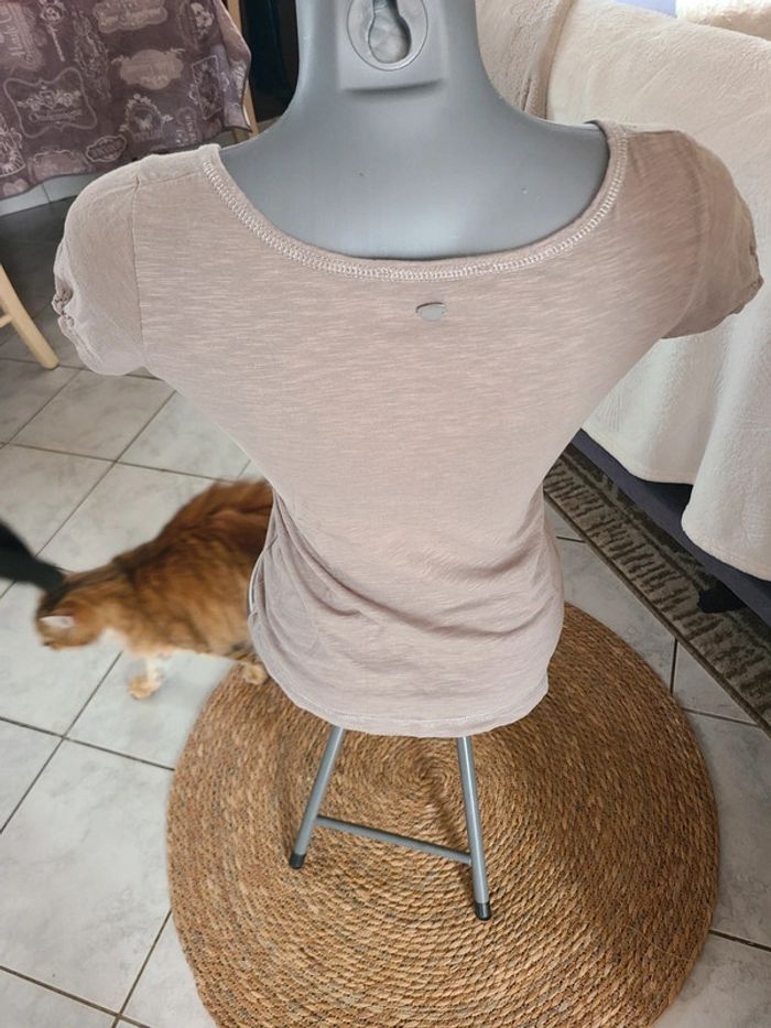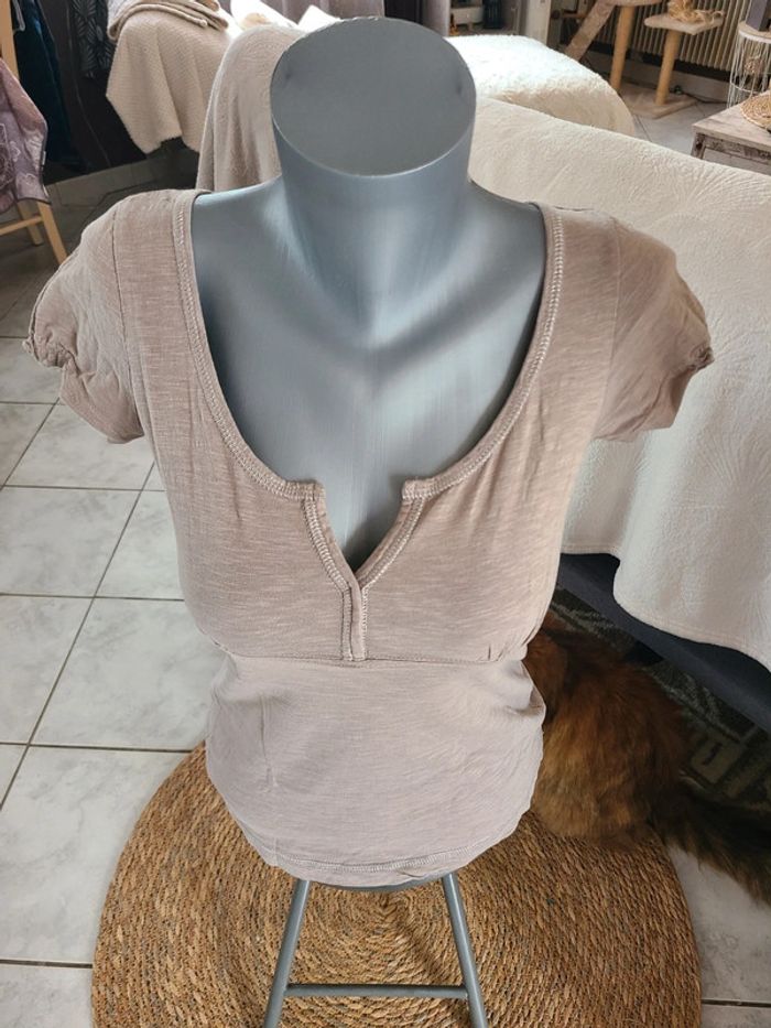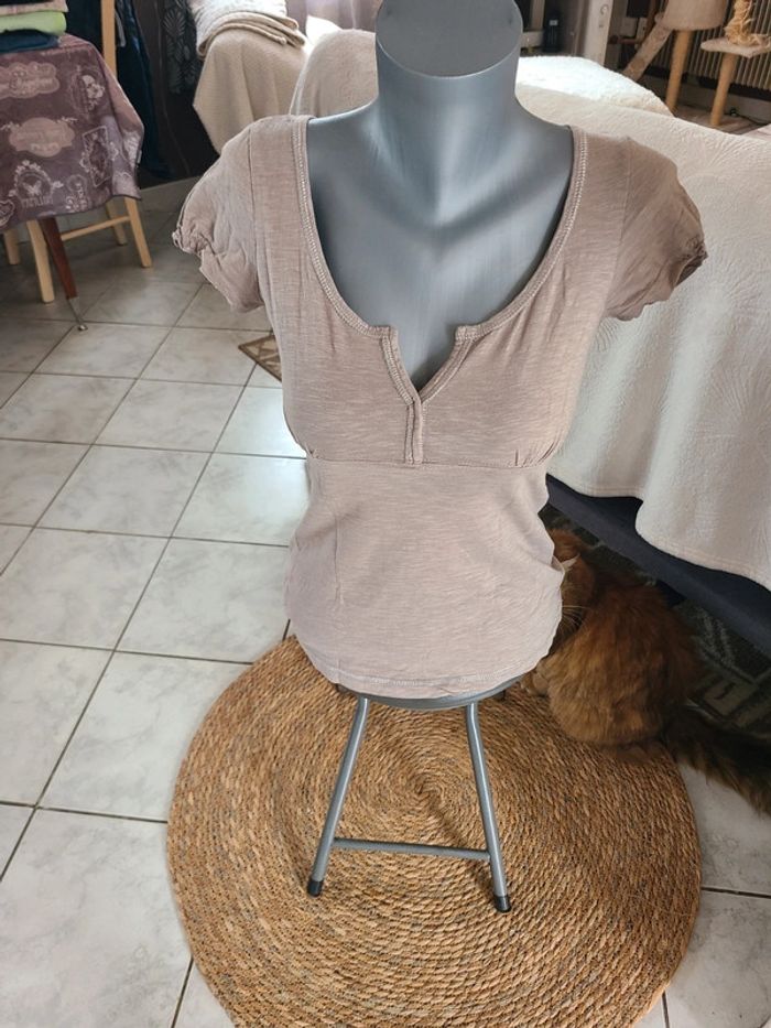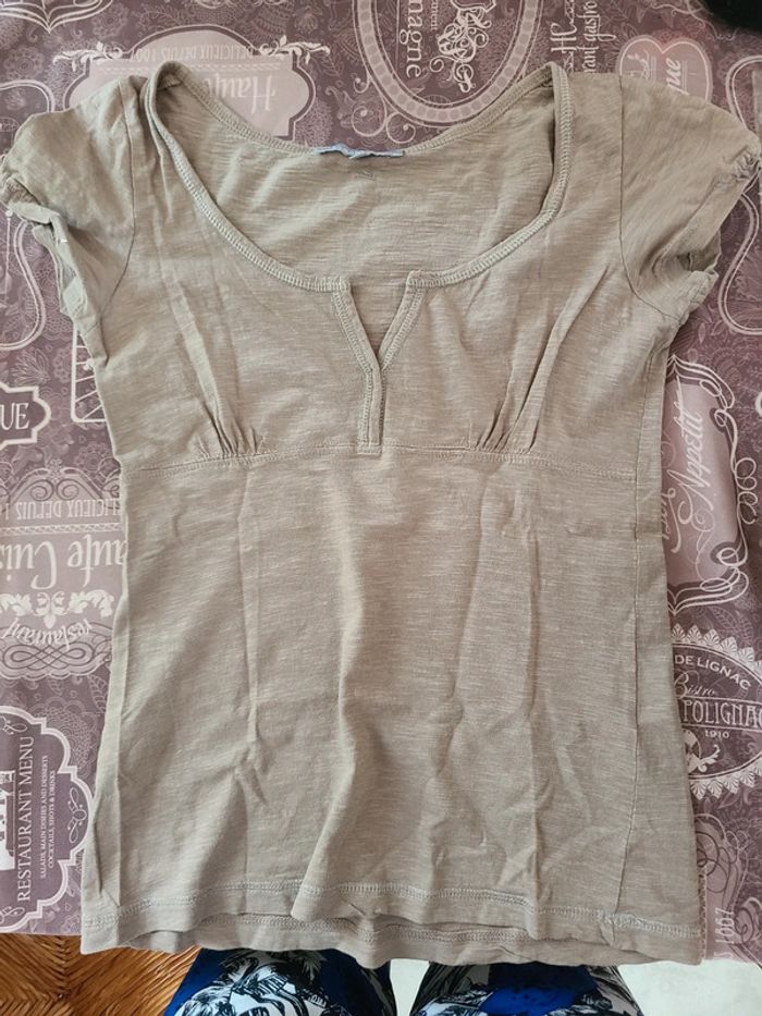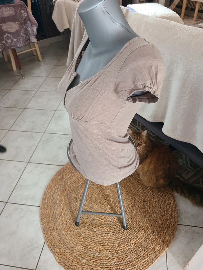 Joli tee shirt femme. Col v Finition pailleté. Froussé léger manches. 56 cm de long et 41 cm d'aisselle à aisselle. Noter 34/36, plutôt 36. En vraiment bon état. Colori entre beige foncé et taupe. Maison non-fumeur Envoi soigné #maddy71femme36