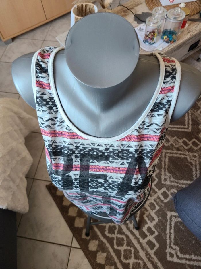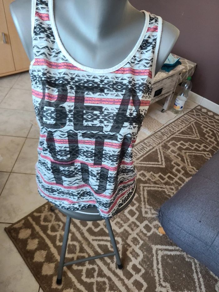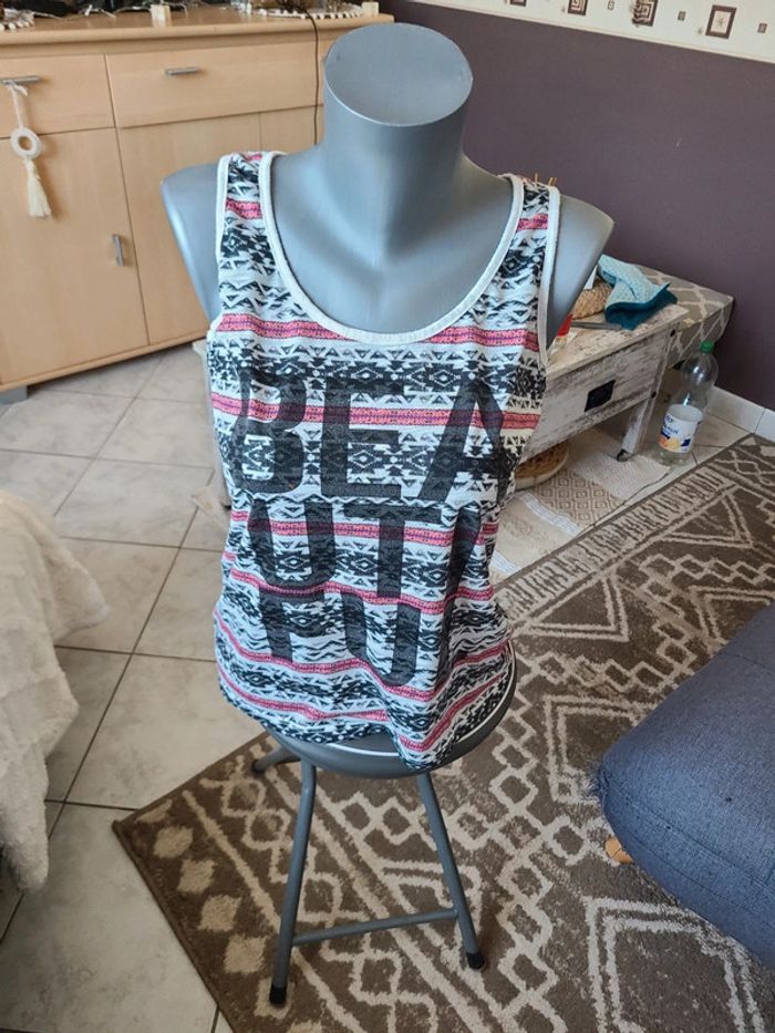 Debardeur avec motifs et écriture. Taille 38 Bon état Maison non-fumeur Envoi soigné #maddy71femme38 #maddy71femme38ete