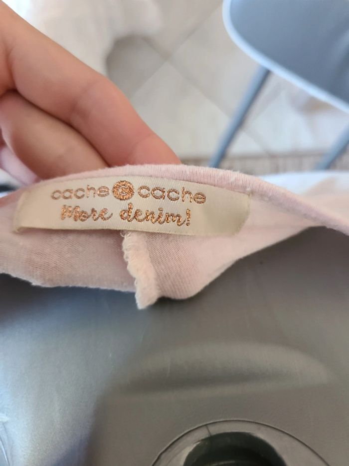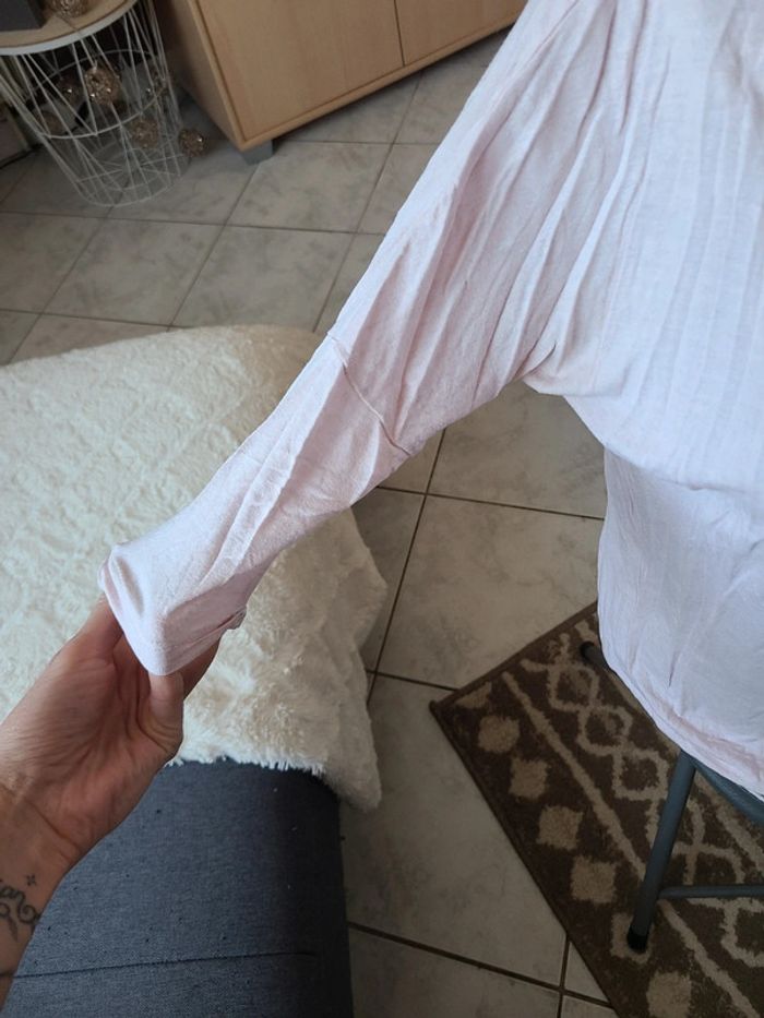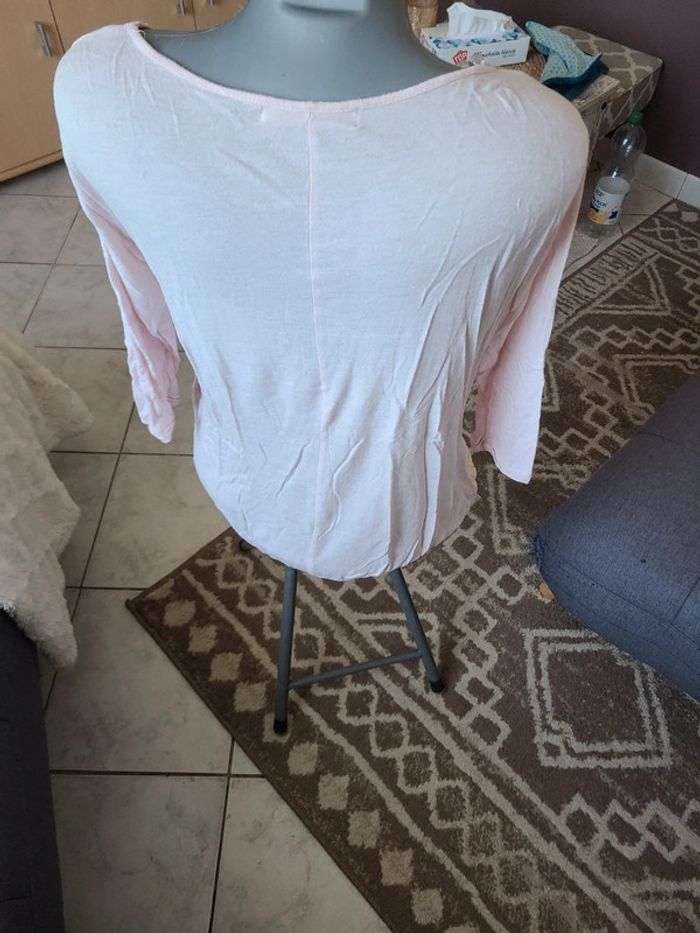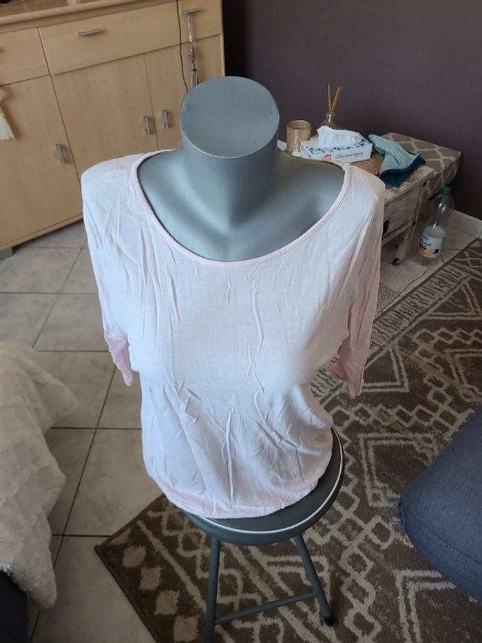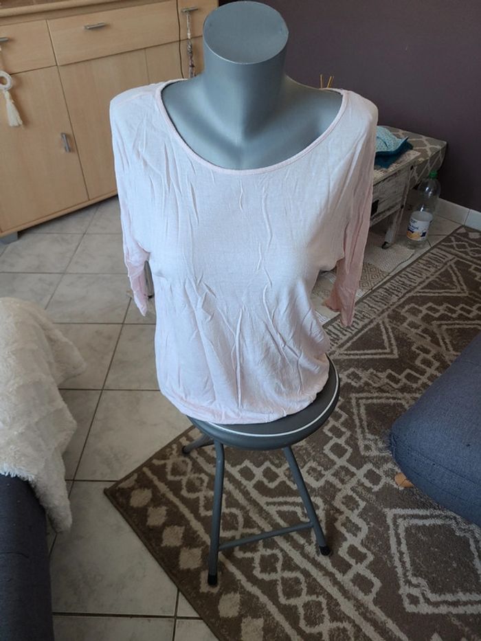 Top rose pâle limite chauve-souris, plutôt loose. Resserré à la taille par un petit élastique. Légèrement pailleté. 58 cm de long et 55 cm d'aisselle à aisselle. Bon état, mini trace(voir photo). Maison non-fumeur Envoi soigné #maddy71femme38