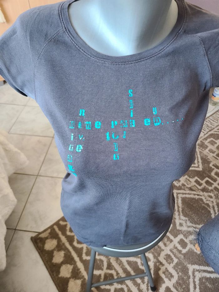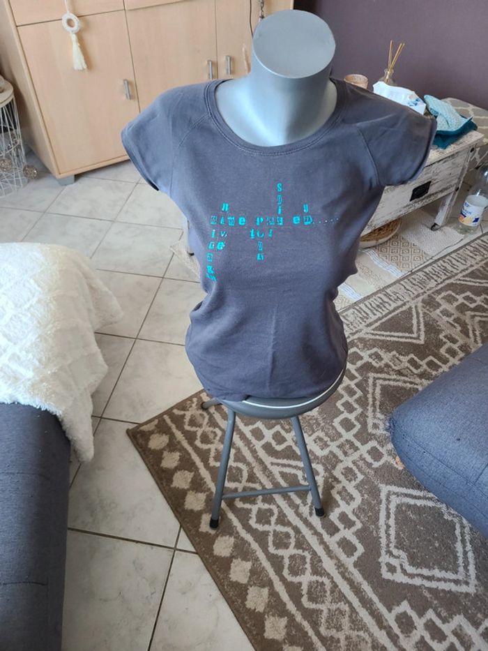 Tee shiet gris écriture turquoise. Basic. Taillant pour du 38 et non du L comme indiqué dessus. Bon état Maison non-fumeur Envoi soigné #maddy71femme38ete #maddy71femme38